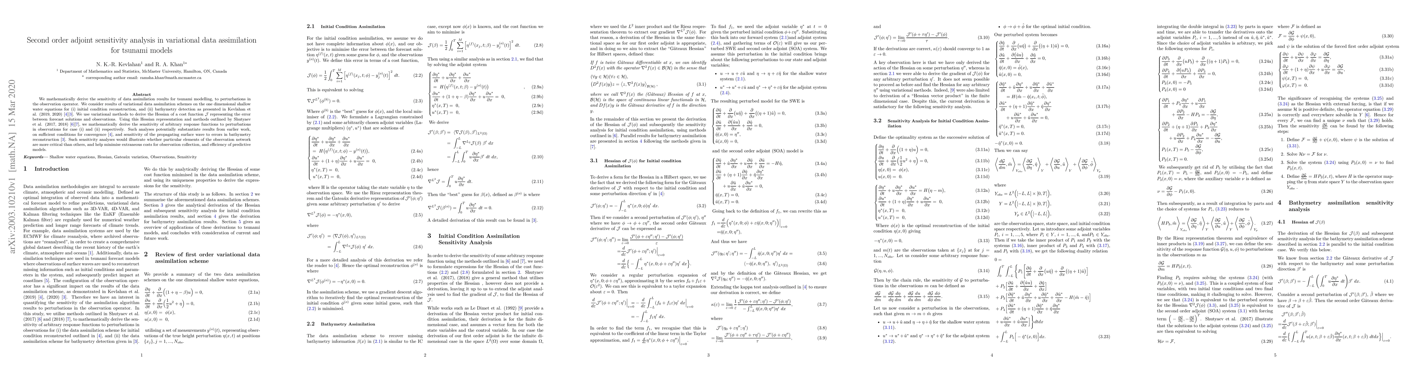 This paper mathematically derives the second-order adjoint sensitivity of tsunami model data assimilation results to perturbations in the observation operator. It uses variational methods to analyze the sensitivity of tsunami model predictions to errors in initial conditions and bathymetry reconstruction, potentially informing optimal observation network design.