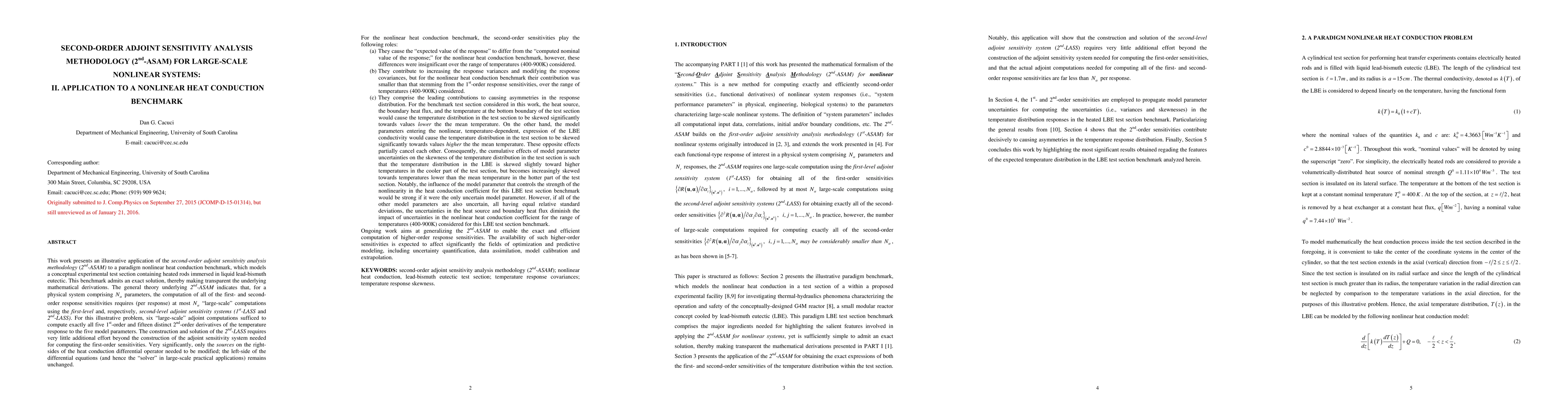 This paper applies the Second-Order Adjoint Sensitivity Analysis Methodology (2nd-ASAM) to a nonlinear heat conduction benchmark, demonstrating its efficiency in computing first and second-order derivatives with minimal computational changes. The methodology requires only modifications to the right-hand side of the heat conduction equations, preserving the solver's integrity.