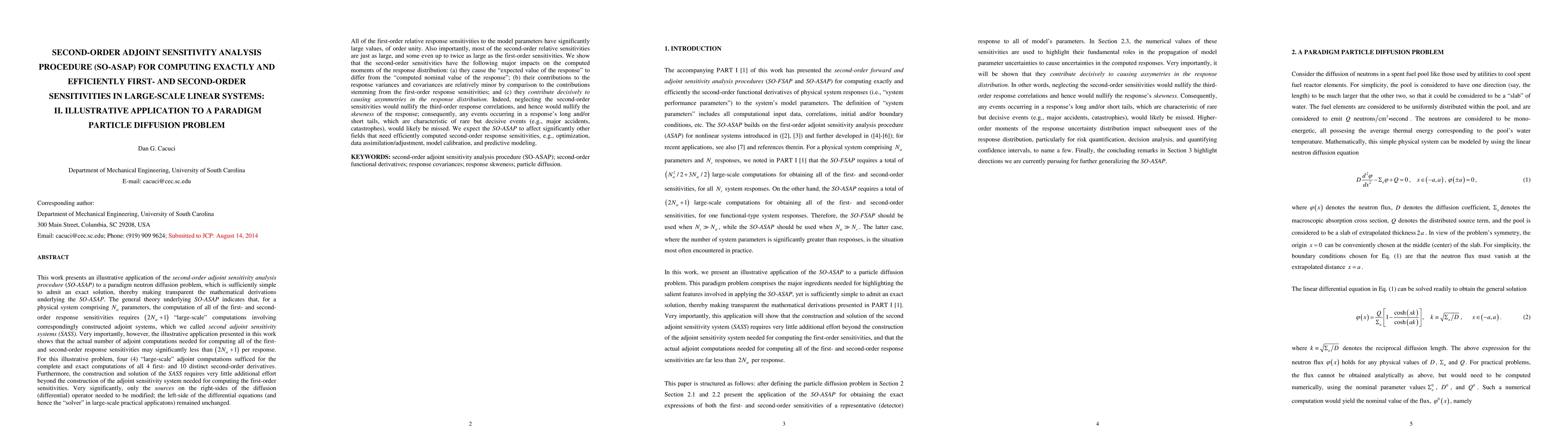 This work presents an illustrative application of the second-order adjoint sensitivity analysis procedure (SO-ASAP) to a paradigm neutron diffusion problem, which is sufficiently simple to admit an exact solution, thereby making transparent the mathematical derivations underlying the SO-ASAP. The illustrative application presented in this work shows that the actual number of adjoint computations needed for computing all of the first- and second-order response sensitivities may significantly less than 2*N+1 per response. For this illustrative problem, four (4) large-scale adjoint computations sufficed for the complete and exact computations of all 4 first- and 10 distinct second-order derivatives. Furthermore, the construction and solution of the SASS requires very little additional effort beyond the construction of the adjoint sensitivity system needed for computing the first-order sensitivities. Only the sources on the right-sides of the diffusion operator needed to be modified; the left-side of the differential equations remained unchanged. Most of the second-order relative sensitivities are just as large as or larger than the first-order ones. We show that the second-order sensitivities cause the expected value of the response to differ from the computed nominal value of the response; and they contribute decisively to causing asymmetries in the response distribution. Neglecting the second-order sensitivities would nullify the third-order response correlations, and hence would nullify the skewness of the response; consequently, any events occurring in a response's long and/or short tails, which are characteristic of rare but decisive events would likely be missed. We expect the SO-ASAP to affect significantly other fields that need efficiently computed second-order response sensitivities, e.g., optimization, data assimilation/adjustment, model calibration, and predictive modeling.