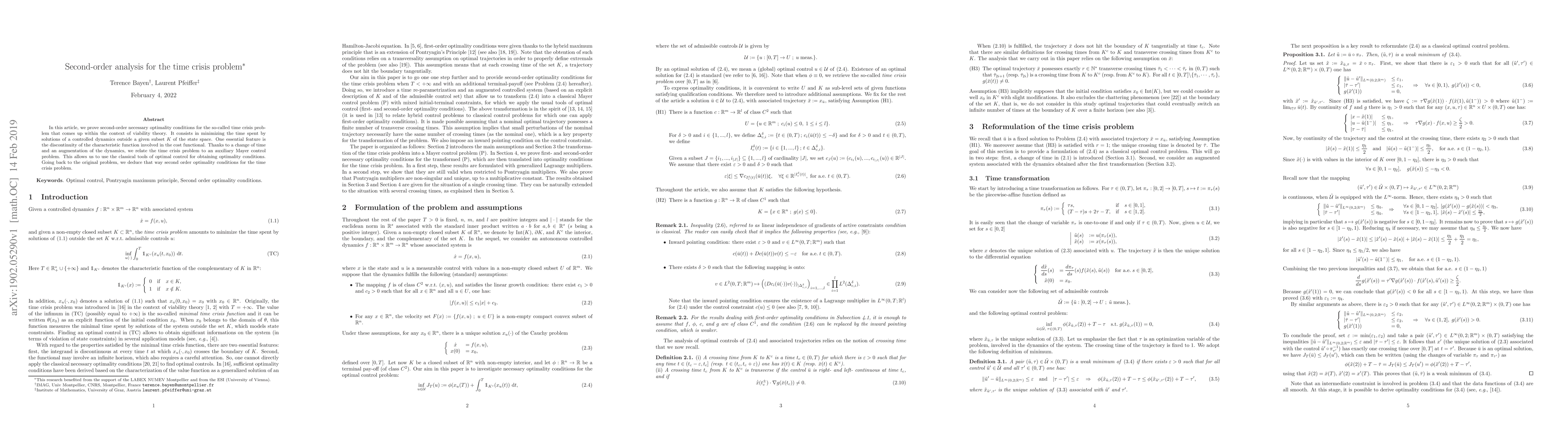Researchers prove second-order optimality conditions for a time crisis problem related to controlled dynamics and state space subsets, using auxiliary control problems and optimal control theory.