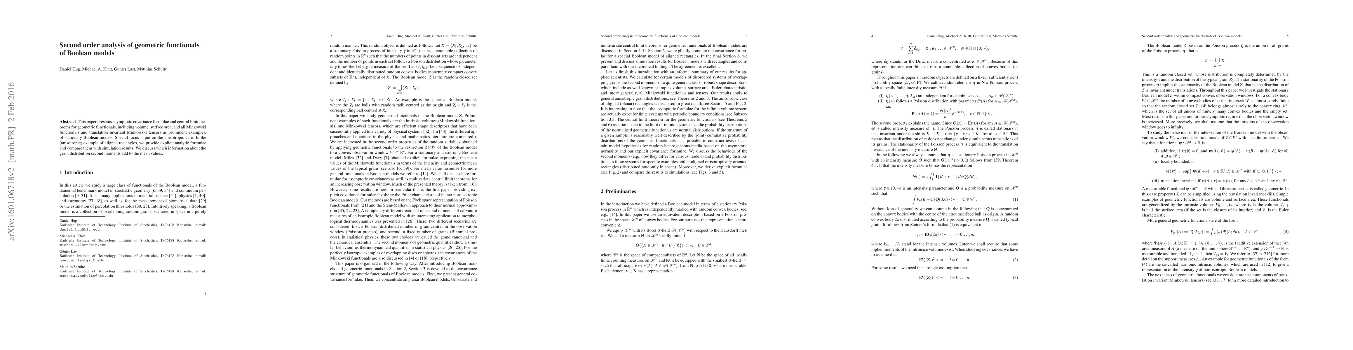 This paper develops second-order analysis for geometric functionals of stationary Boolean models, deriving asymptotic covariance and central limit theorems for volume, surface area, and Minkowski tensors, with a special emphasis on anisotropic cases. Explicit formulae for aligned rectangles are provided and compared to simulations, highlighting the additional insights second moments provide beyond mean values.