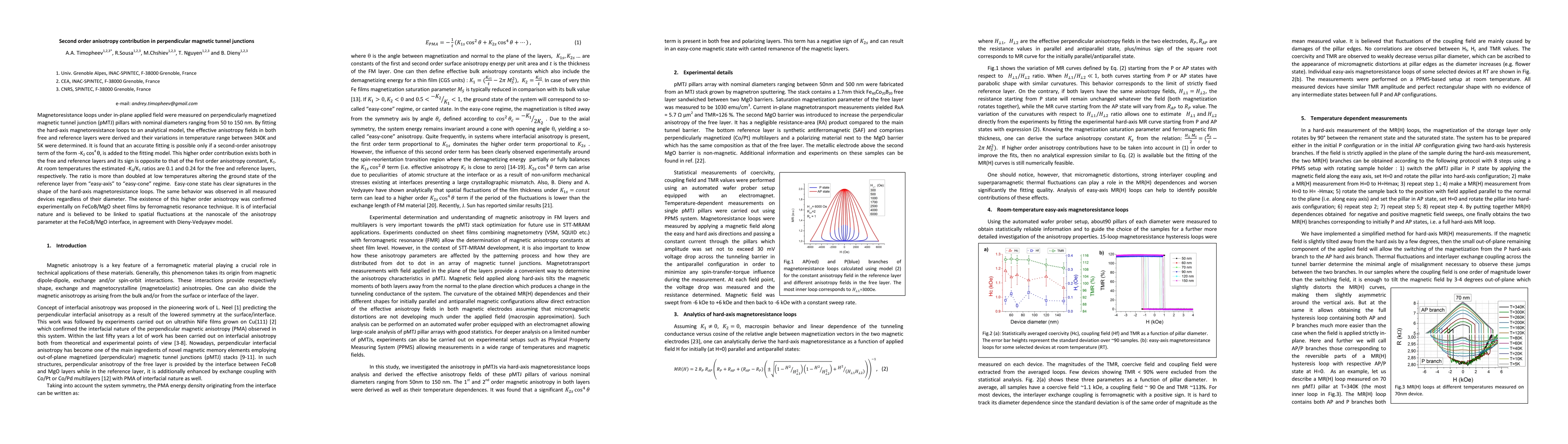 Magnetoresistance loops under in-plane applied field were measured on perpendicularly magnetized magnetic tunnel junction (pMTJ) pillars with nominal diameters ranging from 50 to 150 nm. By fitting the hard-axis magnetoresistance loops to an analytical model, the effective anisotropy fields in both free and reference layers were derived and their variations in temperature range between 340K and 5K were determined. It is found that an accurate fitting is possible only if a second-order anisotropy term of the form $-K_{2}cos^4{\theta}$, is added to the fitting model. This higher order contribution exists both in the free and reference layers and its sign is opposite to that of the first order anisotropy constant, $K_{1}$. At room temperatures the estimated $-K_{2}/K_{1}$ ratios are 0.1 and 0.24 for the free and reference layers, respectively. The ratio is more than doubled at low temperatures altering the ground state of the reference layer from 'easy-axis' to 'easy-cone' regime. Easy-cone state has clear signatures in the shape of the hard-axis magnetoresistance loops. The same behavior was observed in all measured devices regardless of their diameter. The existence of this higher order anisotropy was confirmed experimentally on FeCoB/MgO sheet films by ferromagnetic resonance technique. It is of interfacial nature and is believed to be linked to spatial fluctuations at the nanoscale of the anisotropy parameter at the FeCoB/MgO interface, in agreement with Dieny-Vedyayev model.