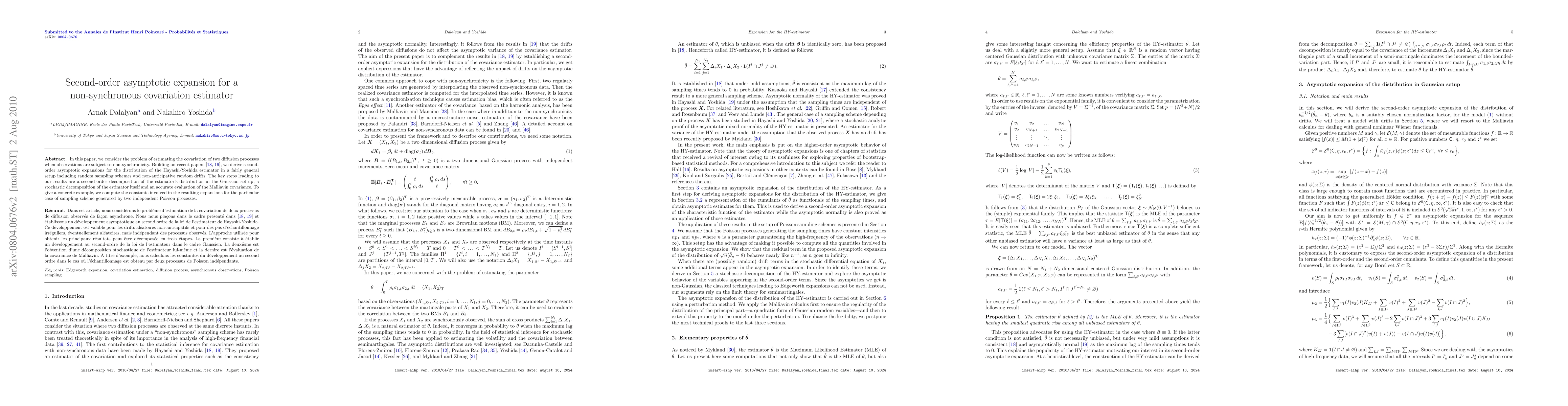 In this paper, we consider the problem of estimating the covariation of two diffusion processes when observations are subject to non-synchronicity. Building on recent papers \cite{Hay-Yos03, Hay-Yos04}, we derive second-order asymptotic expansions for the distribution of the Hayashi-Yoshida estimator in a fairly general setup including random sampling schemes and non-anticipative random drifts. The key steps leading to our results are a second-order decomposition of the estimator's distribution in the Gaussian set-up, a stochastic decomposition of the estimator itself and an accurate evaluation of the Malliavin covariance. To give a concrete example, we compute the constants involved in the resulting expansions for the particular case of sampling scheme generated by two independent Poisson processes.