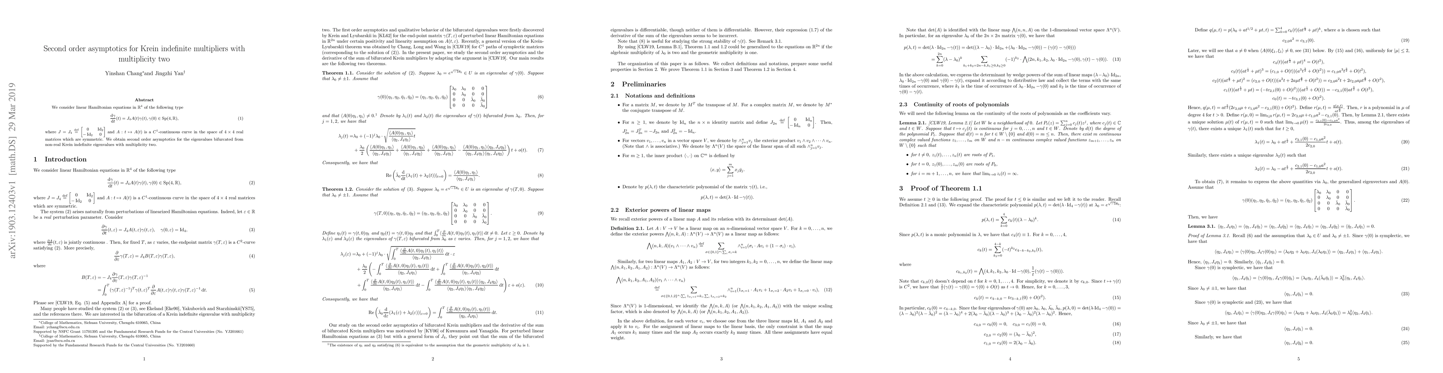 We consider linear Hamiltonian equations in $\mathbb{R}^{4}$ of the following type \begin{equation} \frac{\mathrm{d}\gamma}{\mathrm{d}t}(t)=J_{4}A(t)\gamma(t), \gamma(0)\in\operatorname{Sp}(4,\mathbb{R}), \end{equation} where $J=J_{4}\overset{\text{def}}{=}\begin{bmatrix}0 & \operatorname{Id}_2\\-\operatorname{Id}_2 & 0\end{bmatrix}$ and $A:t\mapsto A(t)$ is a $C^1$-continuous curve in the space of $4\times 4$ real matrices which are symmetric. We obtain second order asymptotics for the eigenvalues bifurcated from non-real Krein indefinite eigenvalues with multiplicity two.