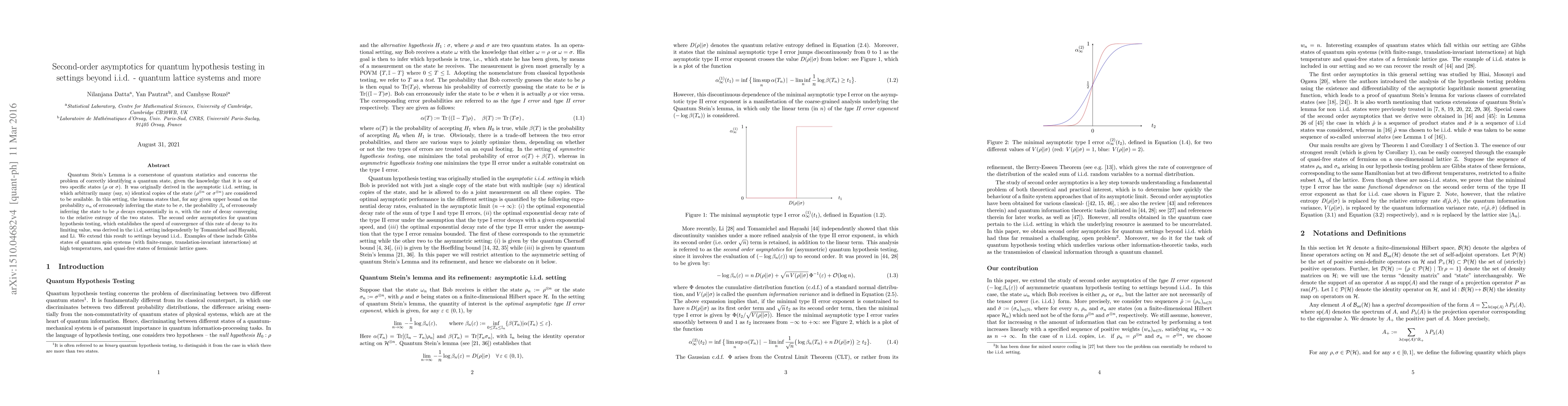 Quantum Stein's Lemma is a cornerstone of quantum statistics and concerns the problem of correctly identifying a quantum state, given the knowledge that it is one of two specific states ($\rho$ or $\sigma$). It was originally derived in the asymptotic i.i.d. setting, in which arbitrarily many (say, $n$) identical copies of the state ($\rho^{\otimes n}$ or $\sigma^{\otimes n}$) are considered to be available. In this setting, the lemma states that, for any given upper bound on the probability $\alpha_n$ of erroneously inferring the state to be $\sigma$, the probability $\beta_n$ of erroneously inferring the state to be $\rho$ decays exponentially in $n$, with the rate of decay converging to the relative entropy of the two states. The second order asymptotics for quantum hypothesis testing, which establishes the speed of convergence of this rate of decay to its limiting value, was derived in the i.i.d. setting independently by Tomamichel and Hayashi, and Li. We extend this result to settings beyond i.i.d.. Examples of these include Gibbs states of quantum spin systems (with finite-range, translation-invariant interactions) at high temperatures.
