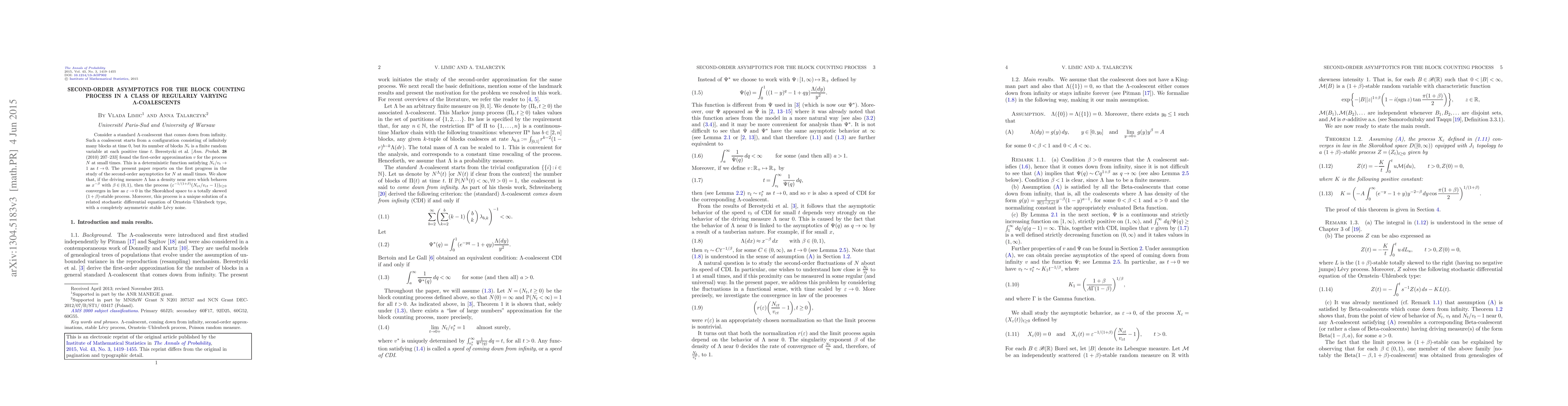 The paper studies second-order asymptotics for a block counting process in regularly varying coalescents. It finds that the process converges to a totally skewed (1+eta)-stable process as time approaches 0.