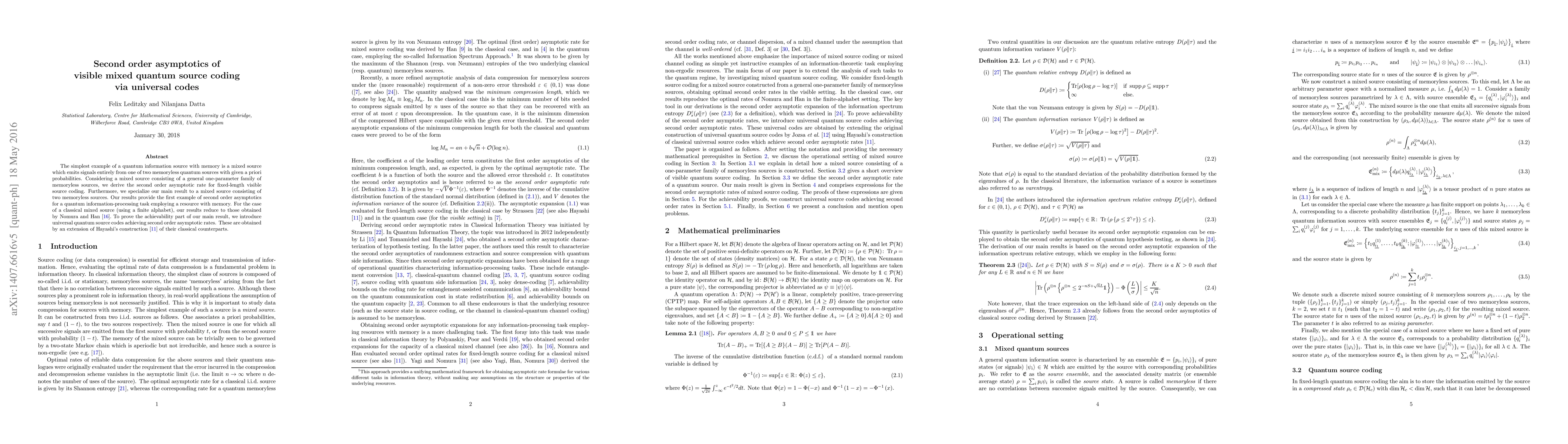This research derives the second order asymptotic rate for fixed-length visible source coding of a memoryless mixed quantum source, extending previous classical results. It introduces universal quantum source codes for achievability, built on Hayashi's construction, providing the first example of second order asymptotics for quantum information processing with memory.