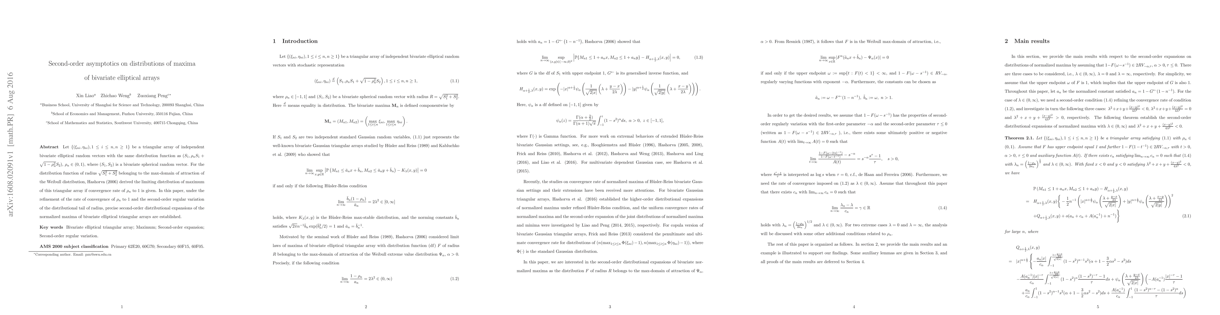 Let $\{ (\xi_{ni}, \eta_{ni}), 1\leq i \leq n, n\geq 1 \}$ be a triangular array of independent bivariate elliptical random vectors with the same distribution function as $(S_{1}, \rho_{n}S_{1}+\sqrt{1-\rho_{n}^2}S_{2})$, $\rho_{n}\in (0,1)$, where $(S_{1},S_{2})$ is a bivariate spherical random vector. For the distribution function of radius $\sqrt{S_{1}^2+S_{2}^2}$ belonging to the max-domain of attraction of the Weibull distribution, Hashorva (2006) derived the limiting distribution of maximum of this triangular array if convergence rate of $\rho_{n}$ to $1$ is given. In this paper, under the refinement of the rate of convergence of $\rho_{n}$ to $1$ and the second-order regular variation of the distributional tail of radius, precise second-order distributional expansions of the normalized maxima of bivariate elliptical triangular arrays are established.