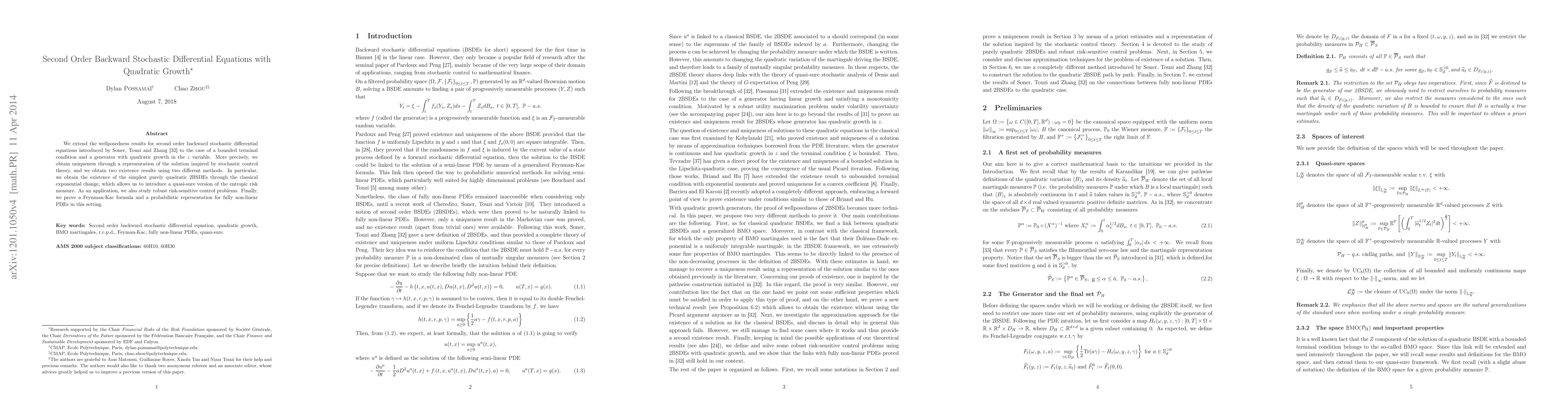 This paper extends the wellposedness of second order backward stochastic differential equations (BSDEs) with quadratic growth, proving uniqueness via stochastic control theory and existence through two methods. It introduces a quasi-sure version of the entropic risk measure and applies these results to robust risk-sensitive control problems, concluding with a Feynman-Kac formula for fully nonlinear PDEs.
