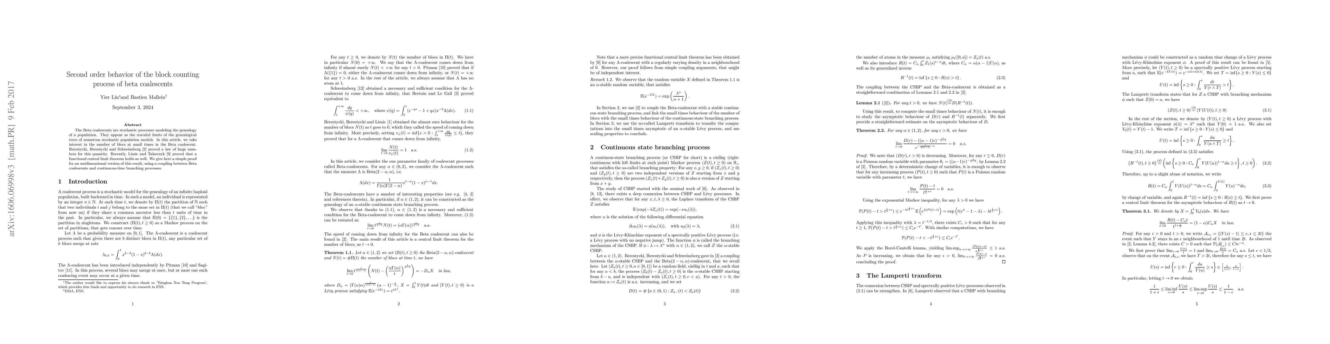 Researchers prove a functional central limit theorem for Beta coalescents, showing that their block counting process at small times converges to a normal distribution. This result has implications for understanding population genetics and genealogical processes.