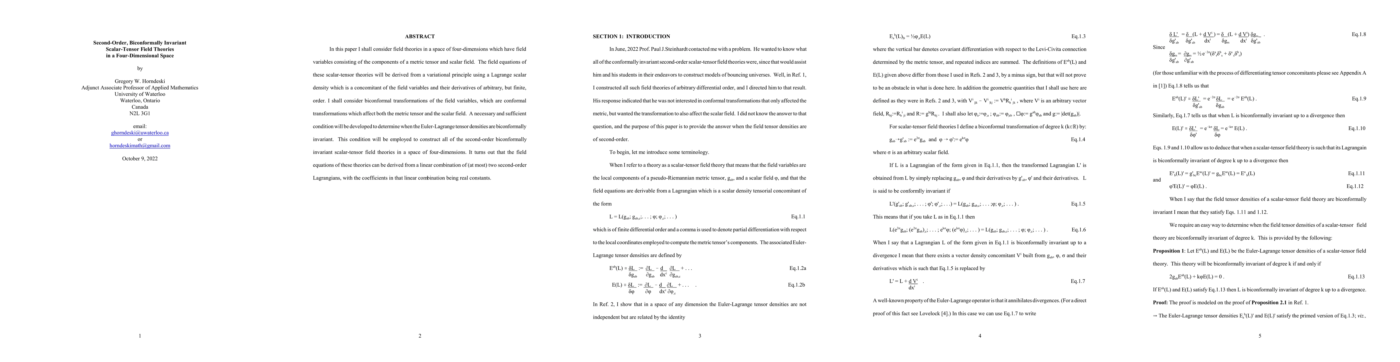 In this paper I shall consider field theories in a space of four-dimensions which have field variables consisting of the components of a metric tensor and scalar field. The field equations of these scalar-tensor field theories will be derivable from a variational principle using a Lagrange scalar density which is a concomitant of the field variables and their derivatives of arbitrary, but finite, order. I shall consider biconformal transformations of the field variables, which are conformal transformations which affect both the metric tensor and scalar field. A necessary and sufficient condition will be developed to determine when the Euler-Lagrange tensor densities are biconformally invariant. This condition will be employed to construct all of the second-order biconformally invariant scalar-tensor field theories in a space of four-dimensions. It turns out that the field equations of these theories can be derived from a linear combination of (at most) two second-order Lagrangians, with the coefficients in that linear combination being real constants.