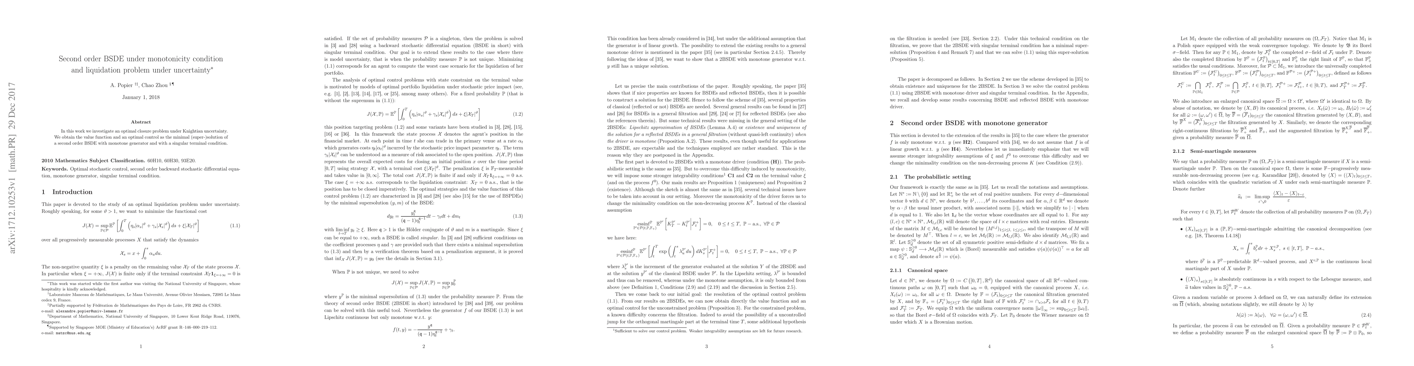In this work we investigate an optimal closure problem under Knightian uncertainty. We obtain the value function and an optimal control as the minimal (super-)solution of a second order BSDE with monotone generator and with a singular terminal condition.