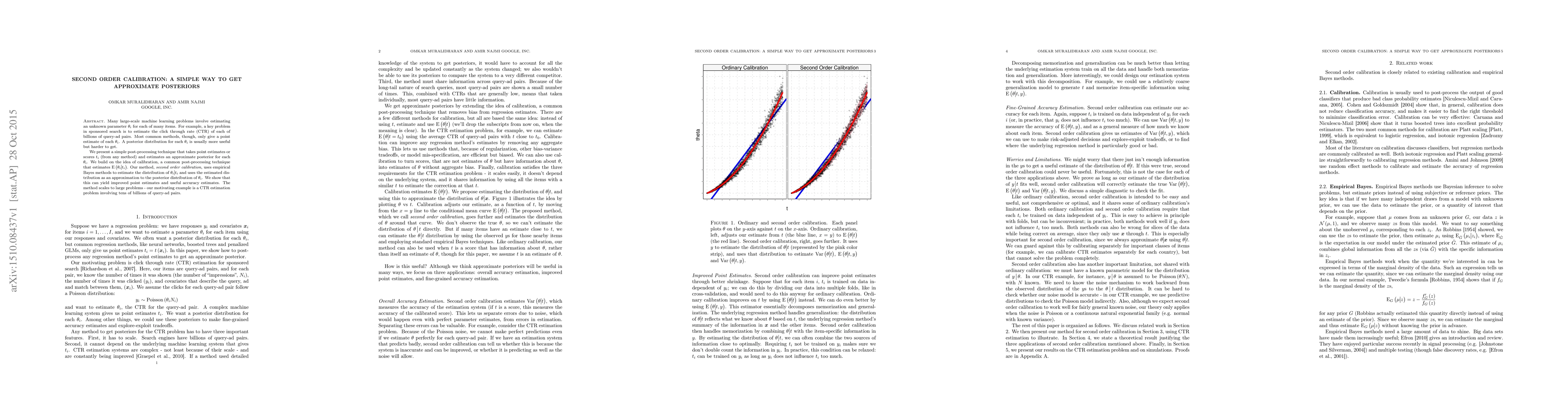Many large-scale machine learning problems involve estimating an unknown parameter $\theta_{i}$ for each of many items. For example, a key problem in sponsored search is to estimate the click through rate (CTR) of each of billions of query-ad pairs. Most common methods, though, only give a point estimate of each $\theta_{i}$. A posterior distribution for each $\theta_{i}$ is usually more useful but harder to get. We present a simple post-processing technique that takes point estimates or scores $t_{i}$ (from any method) and estimates an approximate posterior for each $\theta_{i}$. We build on the idea of calibration, a common post-processing technique that estimates $\mathrm{E}\left(\theta_{i}\!\!\bigm|\!\! t_{i}\right)$. Our method, second order calibration, uses empirical Bayes methods to estimate the distribution of $\theta_{i}\!\!\bigm|\!\! t_{i}$ and uses the estimated distribution as an approximation to the posterior distribution of $\theta_{i}$. We show that this can yield improved point estimates and useful accuracy estimates. The method scales to large problems - our motivating example is a CTR estimation problem involving tens of billions of query-ad pairs.