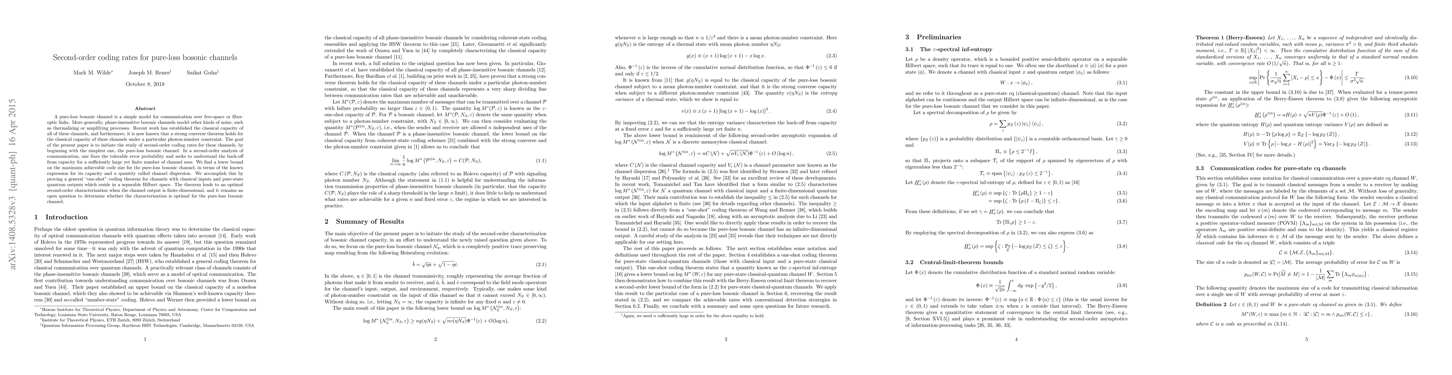 This paper investigates second-order coding rates for pure-loss bosonic channels, establishing a lower bound on the maximum achievable code size in terms of channel capacity and dispersion. It introduces a general "one-shot" coding theorem for channels with classical inputs and quantum outputs, aiming to characterize the back-off from capacity for a finite number of channel uses.