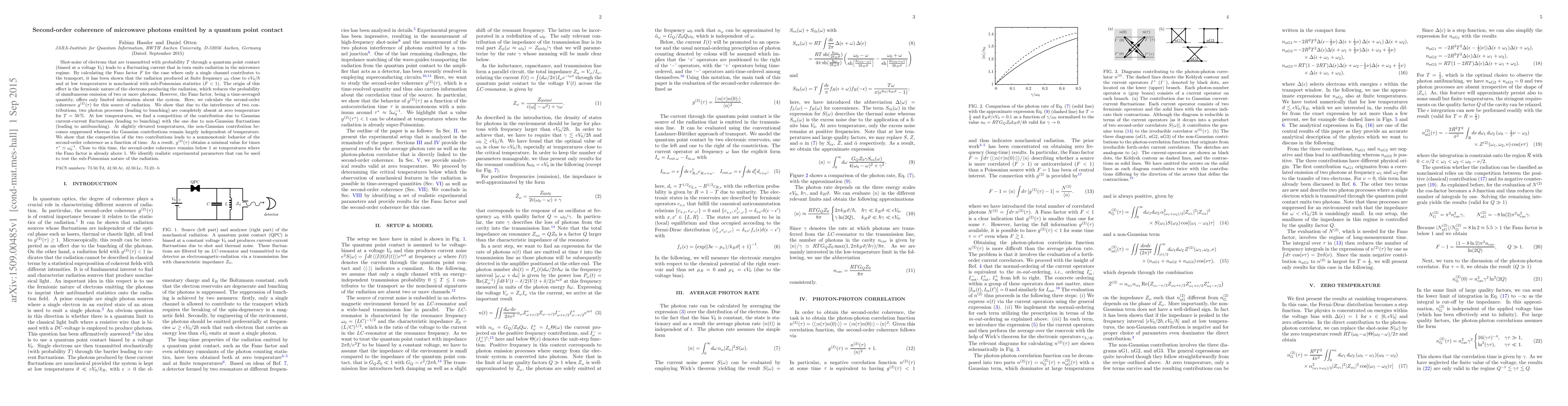This paper investigates the second-order coherence of microwave photons emitted by a quantum point contact, revealing that the radiation exhibits sub-Poissonian statistics due to the fermionic nature of electrons. The study finds that at zero temperature, two-photon bunching is absent, while at low temperatures, a competition between Gaussian and non-Gaussian fluctuations results in nonmonotonic behavior of the second-order coherence, which remains below 1 even when the Fano factor exceeds 1.