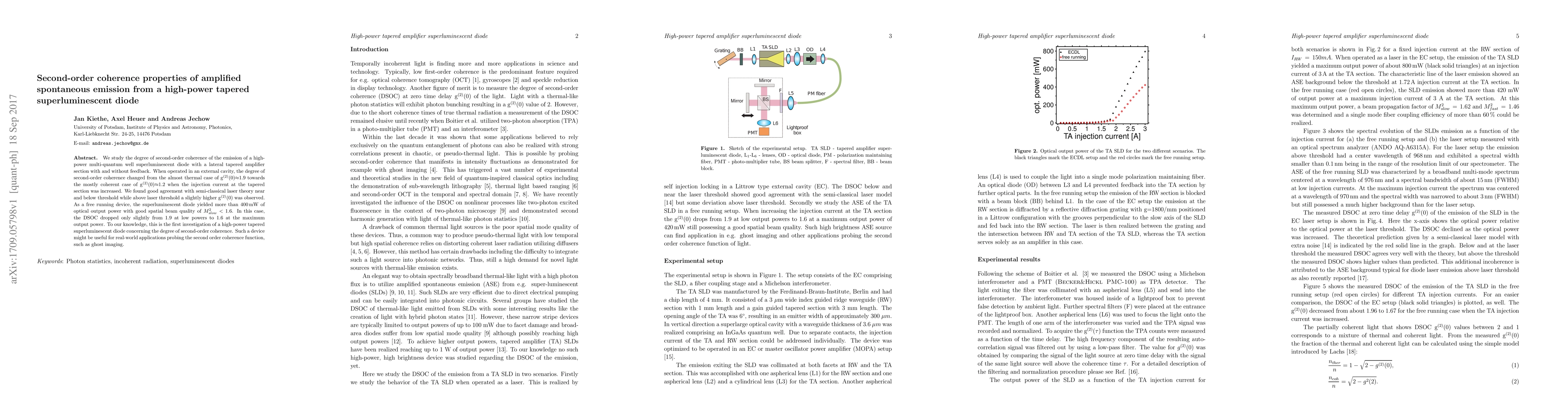 We study the degree of second-order coherence of the emission of a high-power multi-quantum well superluminescent diode with a lateral tapered amplifier section with and without feedback. When operated in an external cavity, the degree of second-order coherence changed from the almost thermal case of g$^{(2)}$(0)$\approx$1.9 towards the mostly coherent case of g$^{(2)}$(0)$\approx$1.2 when the injection current at the tapered section was increased. We found good agreement with semi-classical laser theory near and below threshold while above laser threshold a slightly higher g$^{(2)}$(0) was observed. As a free running device, the superluminescent diode yielded more than 400 mW of optical output power with good spatial beam quality of $M^2_{slow} < 1.6$. In this case, the DSOC dropped only slightly from 1.9 at low powers to 1.6 at the maximum output power. To our knowledge, this is the first investigation of a high-power tapered superluminescent diode concerning the degree of second-order coherence. Such a device might be useful for real-world applications probing the second order coherence function, such as ghost imaging.