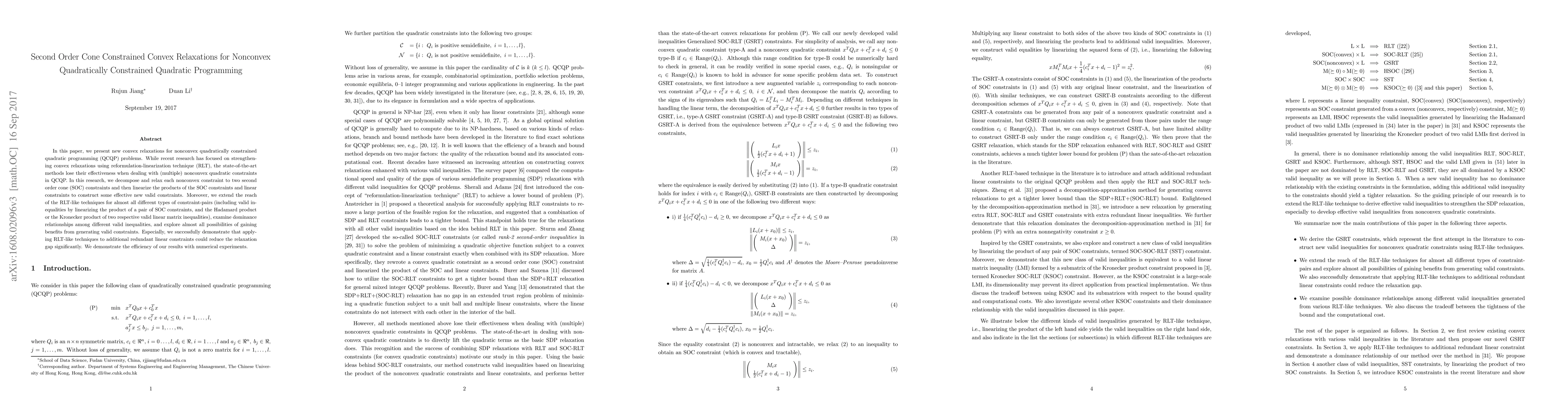 This paper introduces novel convex relaxations for nonconvex quadratically constrained quadratic programming (QCQP) by decomposing nonconvex quadratic constraints into second order cone (SOC) constraints and linearizing their products. The authors extend reformulation-linearization techniques (RLT) to generate valid inequalities, reduce the relaxation gap, and demonstrate efficiency through numerical experiments.