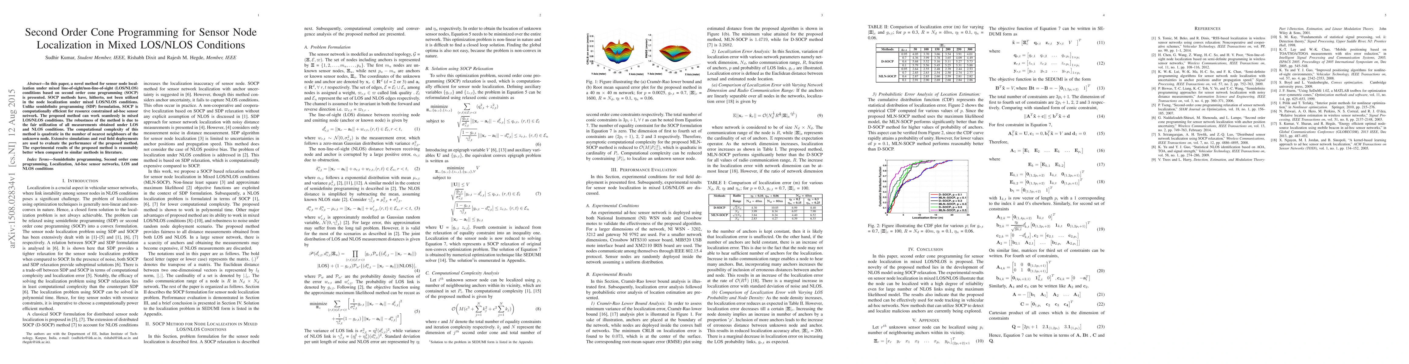 This paper introduces a novel second order cone programming (SOCP) method for sensor node localization in mixed line-of-sight/non-line-of-sight (LOS/NLOS) conditions, which is computationally efficient compared to semidefinite programming (SDP). The proposed method effectively utilizes both LOS and NLOS measurements, demonstrating better performance in extensive simulations and real field deployments.