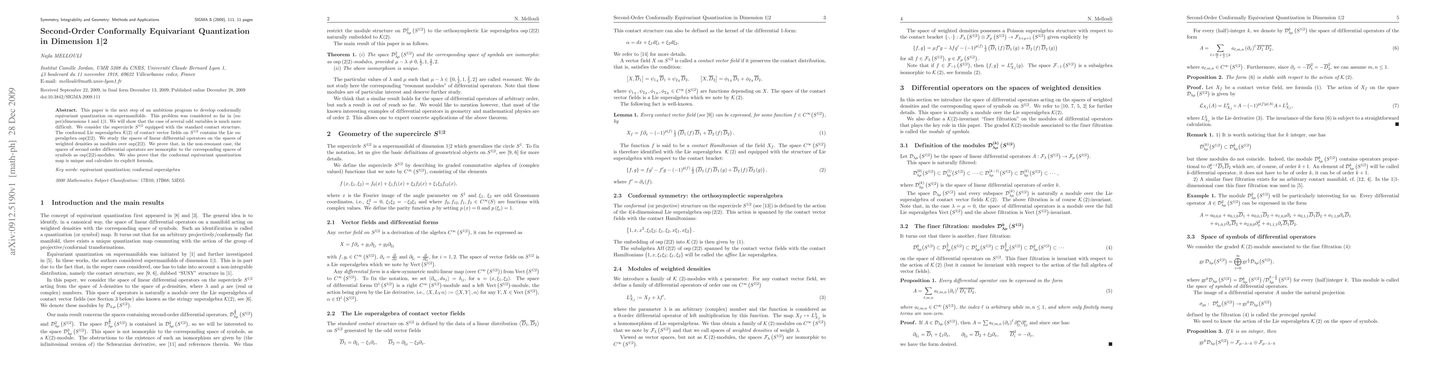 This paper advances the development of conformally equivariant quantization on supermanifolds, focusing on the supercircle $S^{1|2}$ and the conformal Lie superalgebra $\mathcal{K}(2)$. It proves the isomorphism of second-order differential operators to their symbol spaces and establishes the uniqueness of the conformal equivariant quantization map.