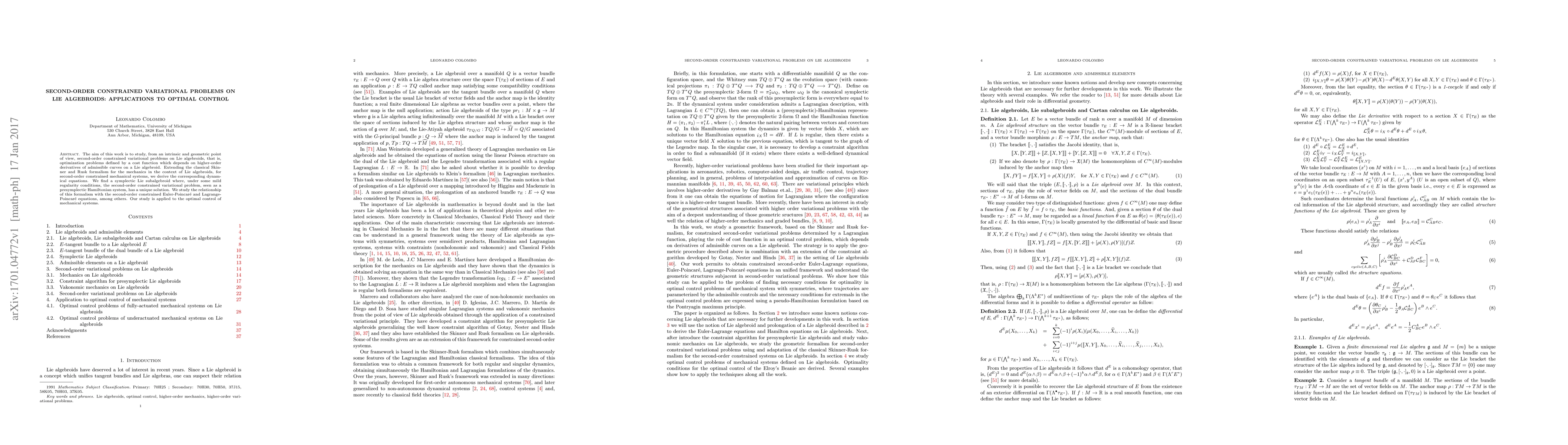 This paper explores second-order constrained variational problems on Lie algebroids, deriving dynamical equations and establishing a unique solution under mild conditions. It applies this formalism to optimal control problems in mechanical systems.