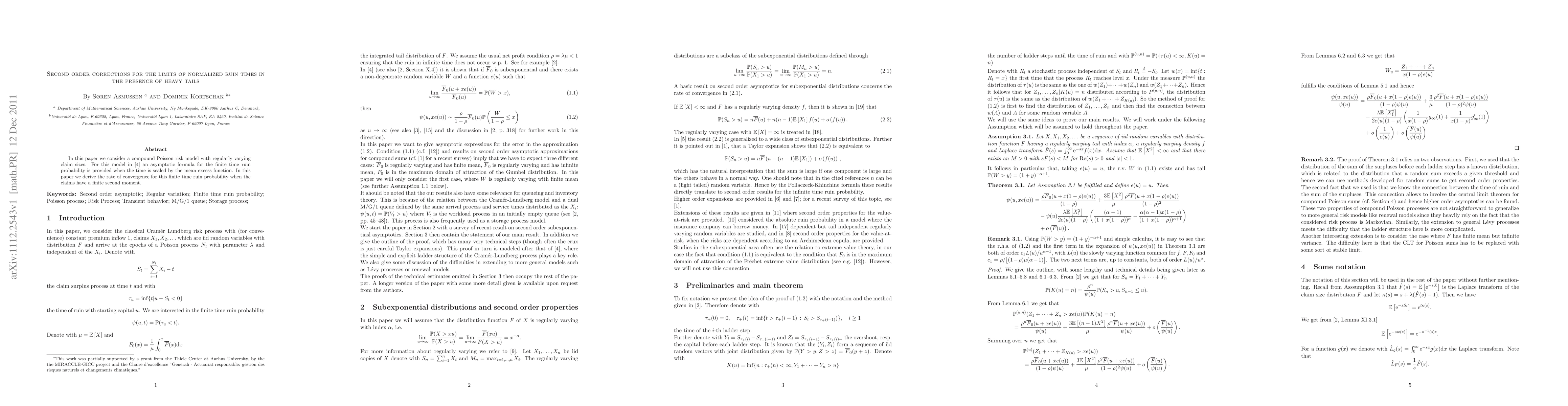This paper derives second-order corrections for the limits of normalized ruin times in a compound Poisson risk model with heavy-tailed claim sizes, extending prior work by providing the rate of convergence for the finite time ruin probability under the condition of finite second moments. This builds on foundational research by Asmussen and Klüppelberg on large deviations for subexponential tails.