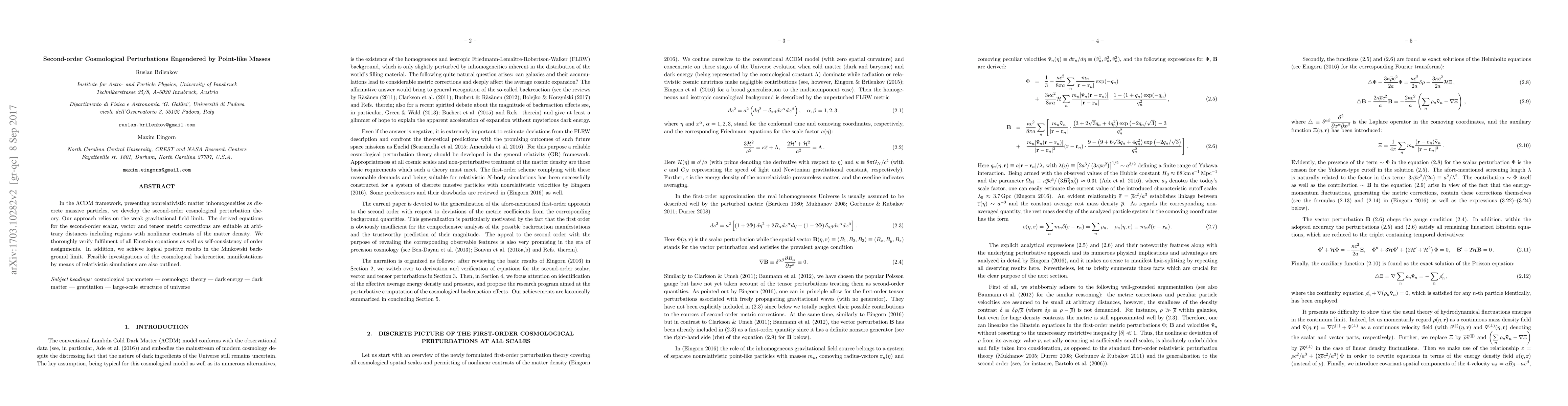 In the $\Lambda$CDM framework, presenting nonrelativistic matter inhomogeneities as discrete massive particles, we develop the second-order cosmological perturbation theory. Our approach relies on the weak gravitational field limit. The derived equations for the second-order scalar, vector and tensor metric corrections are suitable at arbitrary distances including regions with nonlinear contrasts of the matter density. We thoroughly verify fulfilment of all Einstein equations as well as self-consistency of order assignments. In addition, we achieve logical positive results in the Minkowski background limit. Feasible investigations of the cosmological backreaction manifestations by means of relativistic simulations are also outlined.