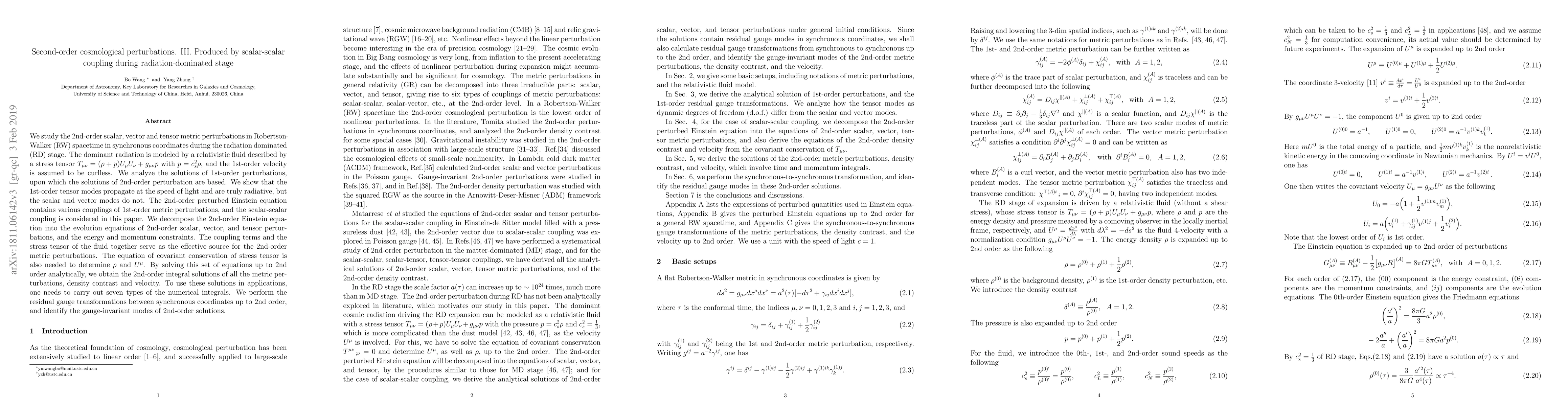 This paper investigates second-order scalar, vector, and tensor metric perturbations in Robertson-Walker spacetime during the radiation-dominated stage, with a focus on scalar-scalar coupling. It analytically solves the second-order perturbed Einstein equations and identifies gauge-invariant modes, revealing that first-order tensor modes propagate at the speed of light while scalar and vector modes do not.