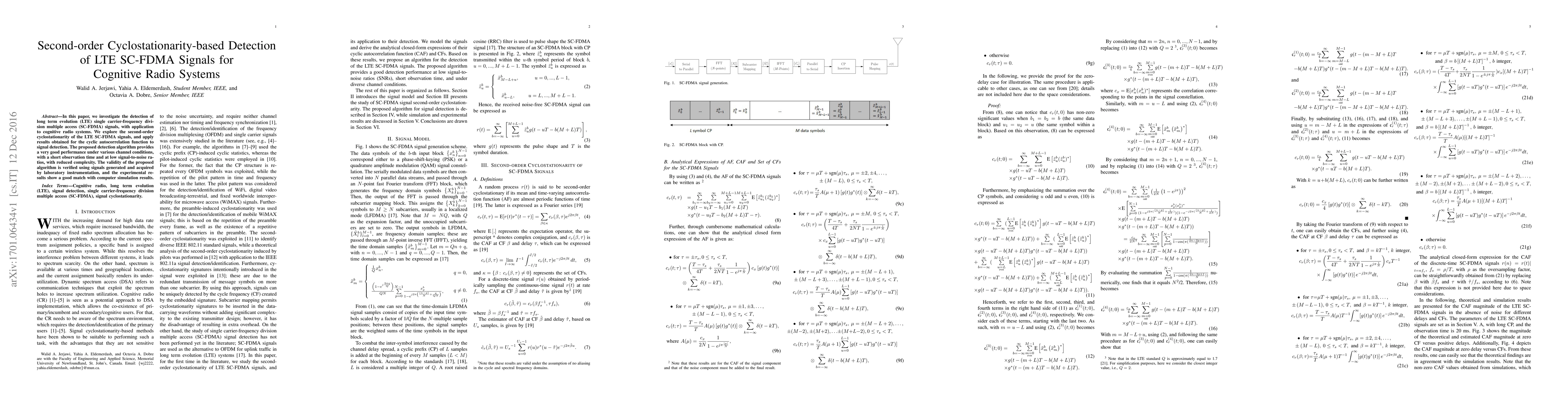 This paper proposes a second-order cyclostationarity-based detection method for LTE SC-FDMA signals, aimed at cognitive radio systems. The method demonstrates effective signal detection under various conditions with low complexity and high performance.