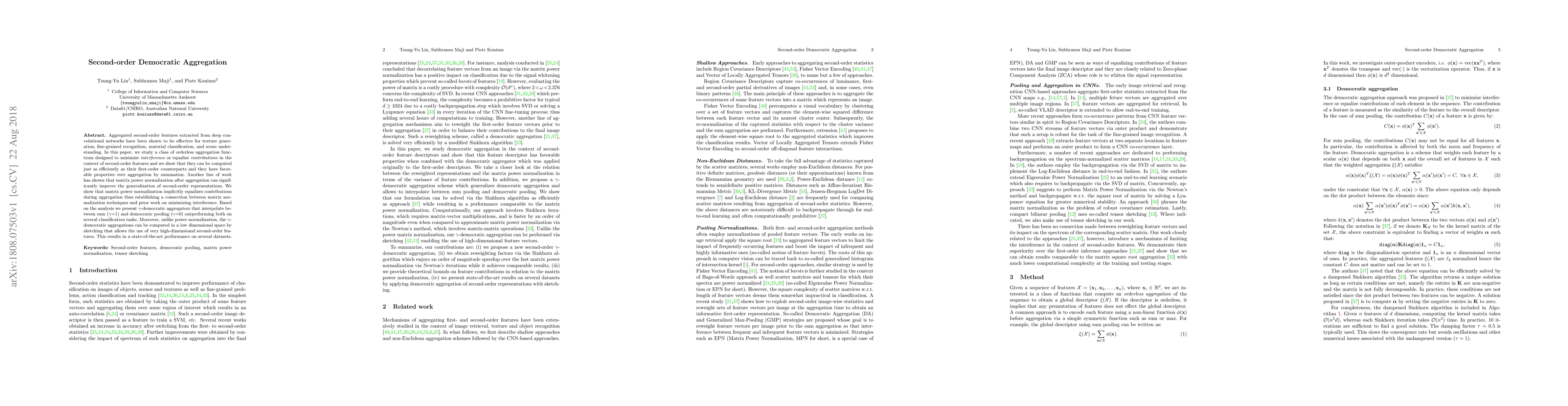 Aggregated second-order features extracted from deep convolutional networks have been shown to be effective for texture generation, fine-grained recognition, material classification, and scene understanding. In this paper, we study a class of orderless aggregation functions designed to minimize interference or equalize contributions in the context of second-order features and we show that they can be computed just as efficiently as their first-order counterparts and they have favorable properties over aggregation by summation. Another line of work has shown that matrix power normalization after aggregation can significantly improve the generalization of second-order representations. We show that matrix power normalization implicitly equalizes contributions during aggregation thus establishing a connection between matrix normalization techniques and prior work on minimizing interference. Based on the analysis we present {\gamma}-democratic aggregators that interpolate between sum ({\gamma}=1) and democratic pooling ({\gamma}=0) outperforming both on several classification tasks. Moreover, unlike power normalization, the {\gamma}-democratic aggregations can be computed in a low dimensional space by sketching that allows the use of very high-dimensional second-order features. This results in a state-of-the-art performance on several datasets.