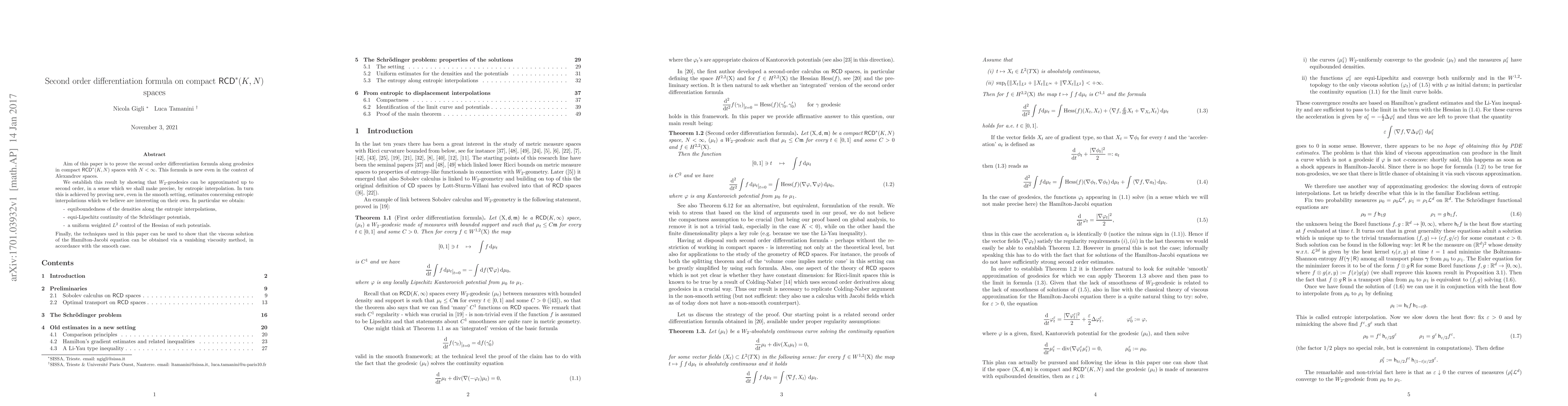Aim of this paper is to prove the second order differentiation formula along geodesics in compact $RCD^*(K,N)$ spaces with $N<\infty$. This formula is new even in the context of Alexandrov spaces. We establish this result by showing that $W_2$-geodesics can be approximated up to second order, in a sense which we shall make precise, by entropic interpolation. In turn this is achieved by proving new, even in the smooth setting, estimates concerning entropic interpolations which we believe are interesting on their own. In particular we obtain: - equiboundedness of the densities along the entropic interpolations, - equi-Lipschitz continuity of the Schr\"odinger potentials, - a uniform weighted L2 control of the Hessian of such potentials. Finally, the techniques used in this paper can be used to show that the viscous solution of the Hamilton-Jacobi equation can be obtained via a vanishing viscosity method, in accordance with the smooth case.