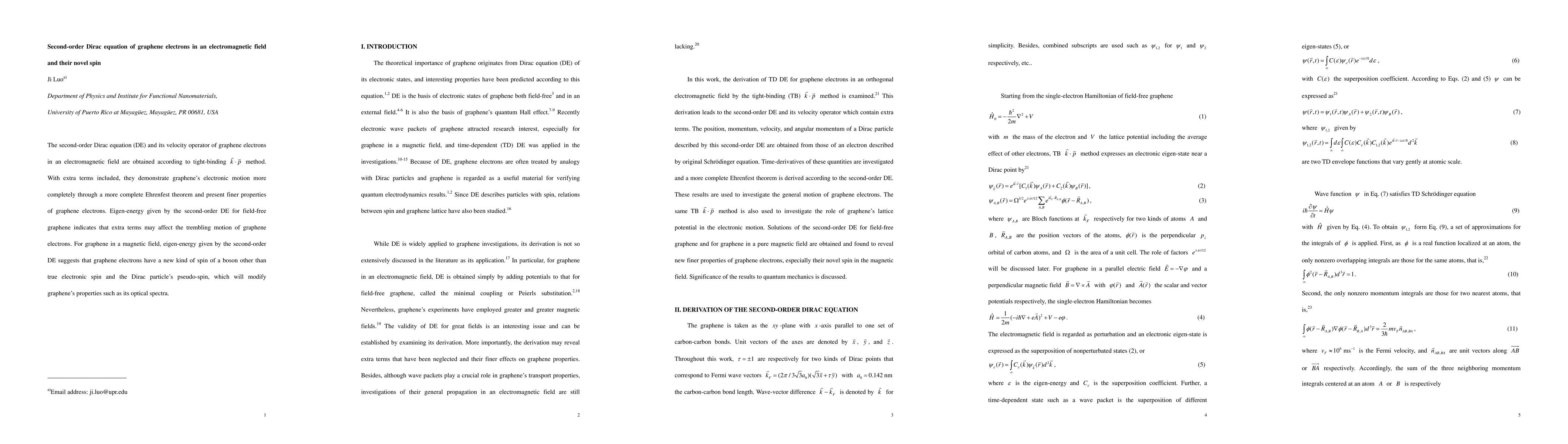 This research paper develops a new equation to describe graphene electrons in an electromagnetic field, revealing novel spin properties that could affect graphene's optical spectra and behavior.