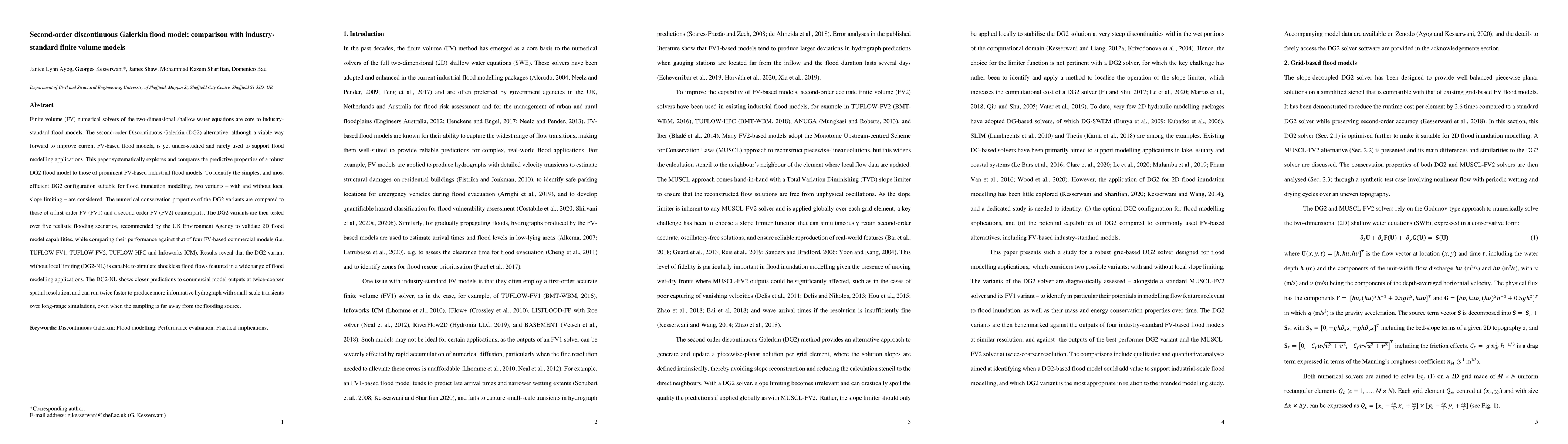 This paper compares the predictive performance of a second-order Discontinuous Galerkin (DG2) flood model against industry-standard finite volume (FV) models, finding that the DG2 variant without local slope limiting (DG2-NL) simulates flood flows more effectively and runs faster while maintaining accuracy.