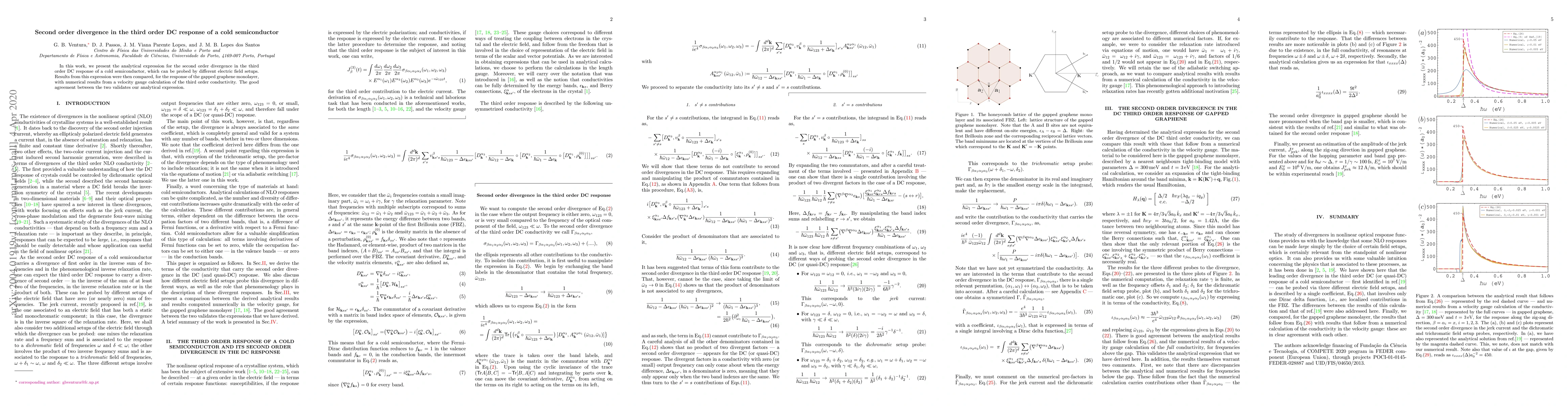 In this work, we present the analytical expression for the second order divergence in the third order DC response of a cold semiconductor, which can be probed by different electric field setups. Results from this expression were then compared, for the response of the gapped graphene monolayer, with numerical results from a velocity gauge calculation of the third order conductivity. The good agreement between the two validates our analytical expression.