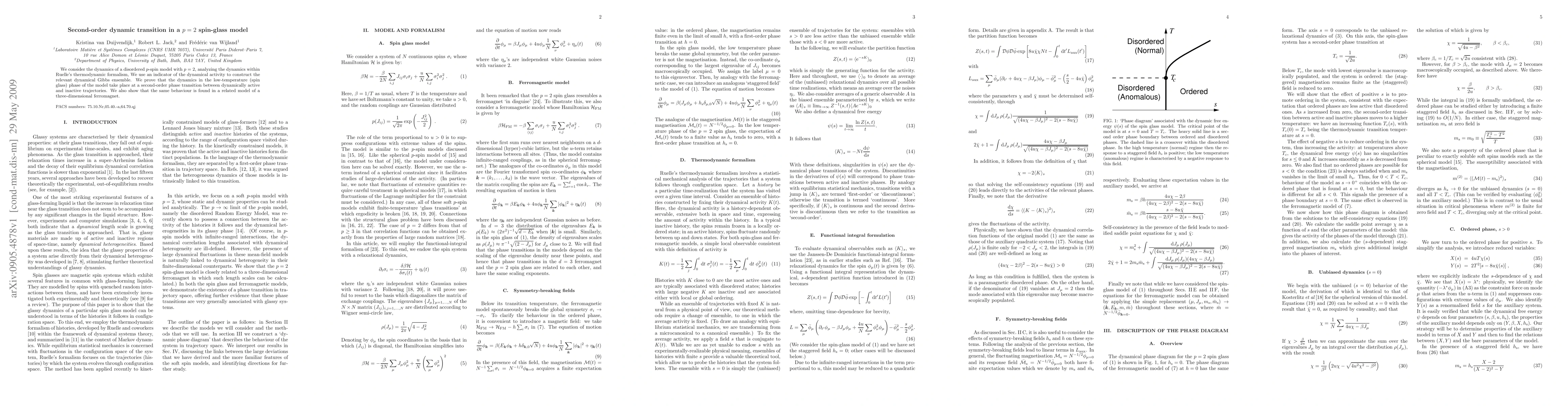 This paper investigates the dynamics of a p=2 spin-glass model, revealing a second-order dynamic transition in the low-temperature phase. It employs Ruelle's thermodynamic formalism and identifies a dynamical Gibbs ensemble, showing similar behavior in a three-dimensional ferromagnet model.