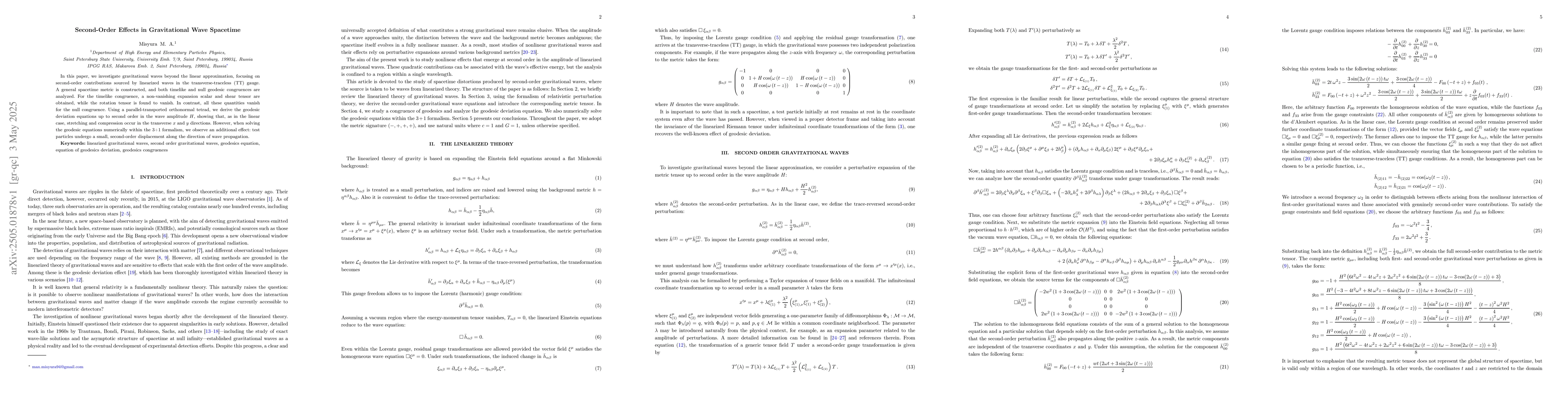 The paper presents a detailed derivation and analysis of second-order metric perturbations in general relativity, constructing a spacetime metric that includes both first- and second-order gravitational wave contributions and solving geodesic equations numerically to reveal small second-order displacements.