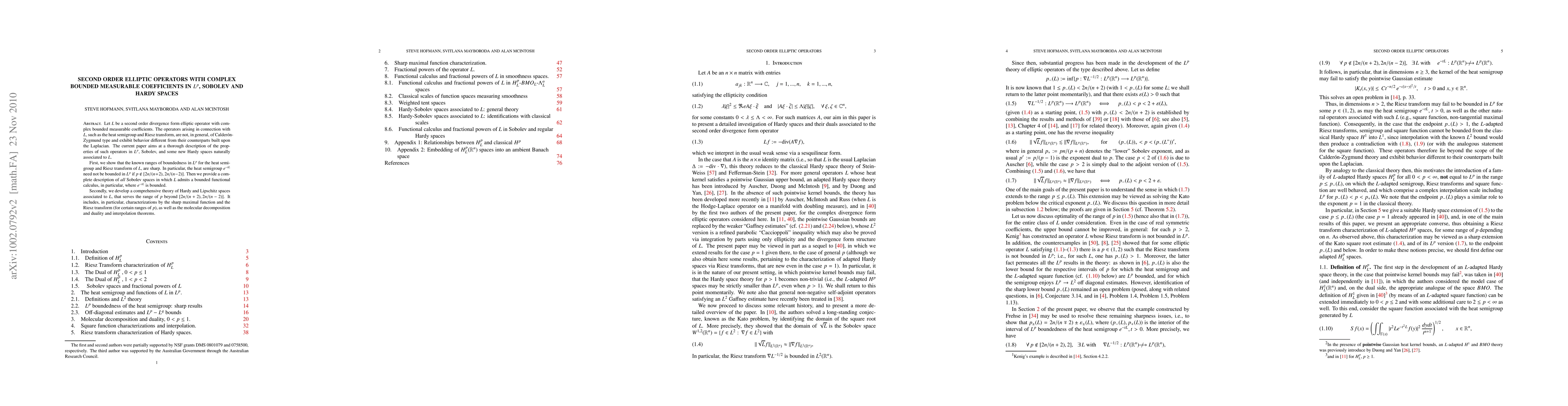 This paper examines second-order elliptic operators with complex bounded measurable coefficients in various function spaces. It establishes sharp $L^p$ bounds for the heat semigroup and Riesz transform, delineates all Sobolev spaces where these operators admit bounded functional calculus, and develops a theory for Hardy and Lipschitz spaces extending beyond traditional bounds.