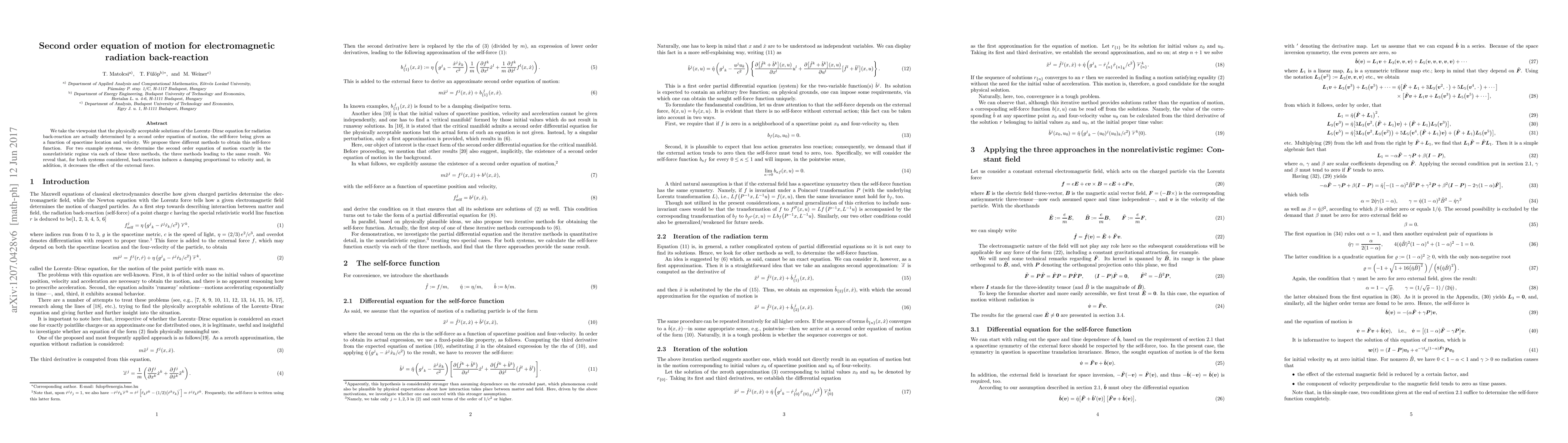 We take the viewpoint that the physically acceptable solutions of the Lorentz--Dirac equation for radiation back-reaction are actually determined by a second order equation of motion, the self-force being given as a function of spacetime location and velocity. We propose three different methods to obtain this self-force function. For two example systems, we determine the second order equation of motion exactly in the nonrelativistic regime via each of these three methods, the three methods leading to the same result. We reveal that, for both systems considered, back-reaction induces a damping proportional to velocity and, in addition, it decreases the effect of the external force.