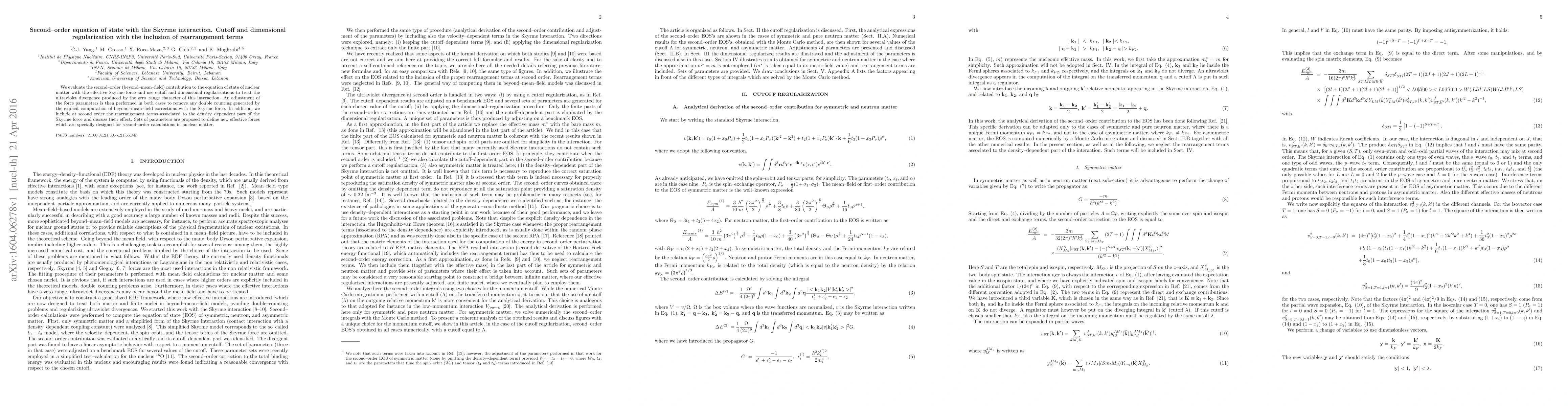 This paper evaluates the second-order contribution to the nuclear matter equation of state using the Skyrme interaction, employing cutoff and dimensional regularizations to manage ultraviolet divergences. It also includes rearrangement terms and proposes new effective force parameters for second-order calculations.