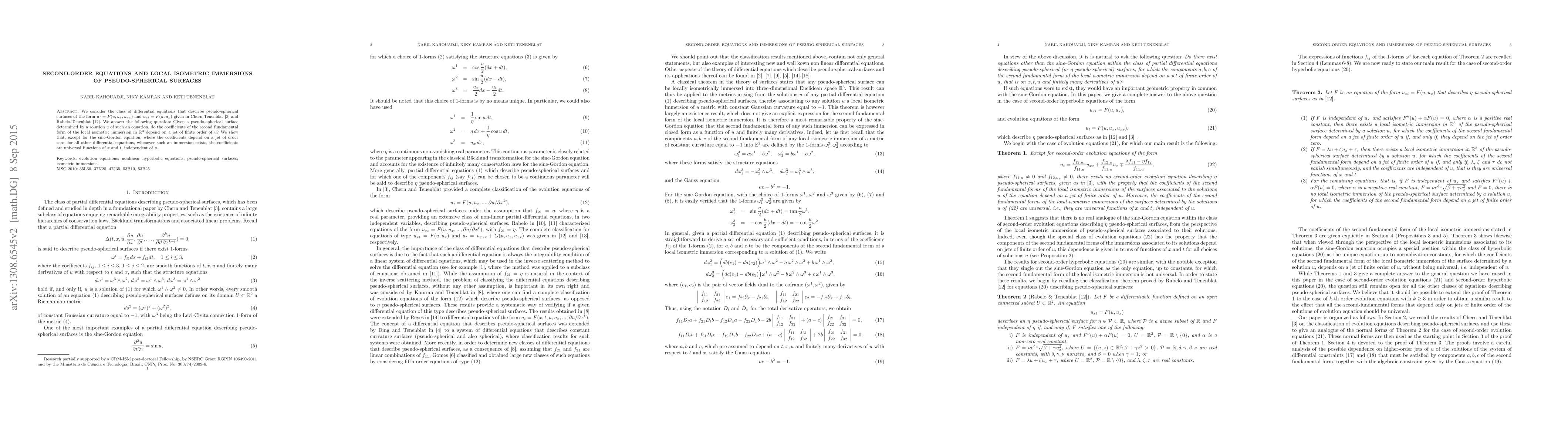 This paper investigates second-order differential equations describing pseudo-spherical surfaces and their local isometric immersions in $\mathbb{R}^3$. It finds that, except for the sine-Gordon equation, the coefficients of the second fundamental form for these immersions are universal functions of $x$ and $t$, independent of the specific surface solution.