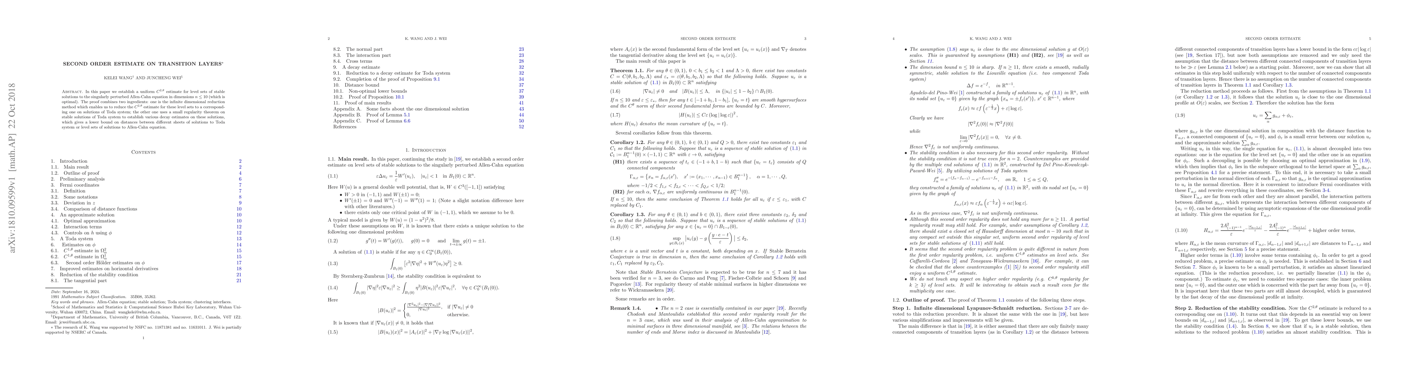 In this paper we establish a uniform $C^{2,\theta}$ estimate for level sets of stable solutions to the singularly perturbed Allen-Cahn equation in dimensions $ n\leq 10$ (which is optimal). The proof combines two ingredients: one is the infinite dimensional reduction method which enables us to reduce the $C^{2,\theta}$ estimate for these level sets to a corresponding one on solutions of Toda system; the other one uses a small regularity theorem on stable solutions of Toda system to establish various decay estimates on these solutions, which gives a lower bound on distances between different sheets of solutions to Toda system or level sets of solutions to Allen-Cahn equation.