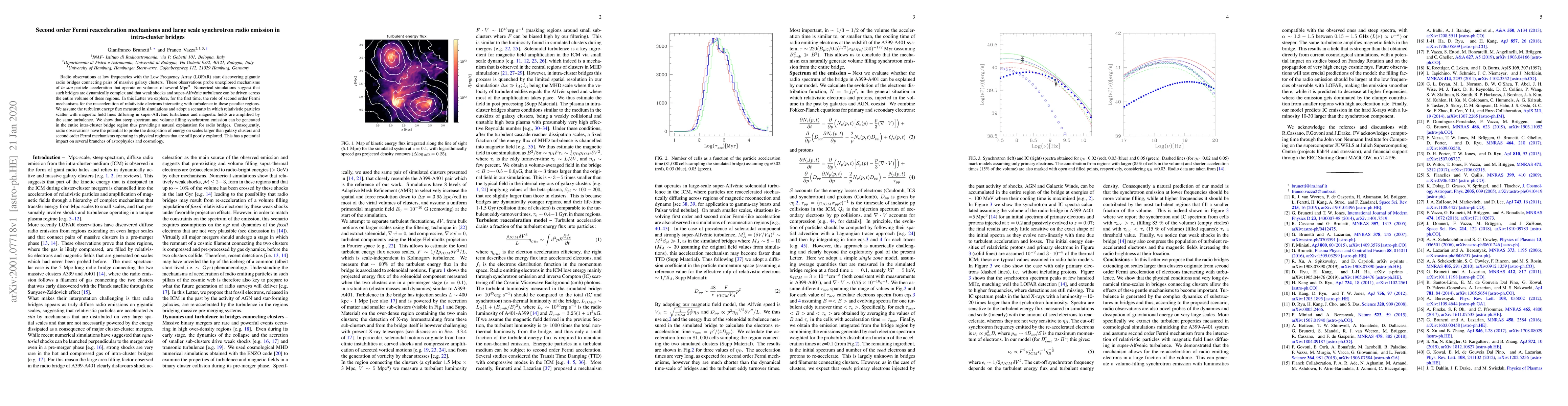 Radio bridges connecting galaxy clusters are explained by second-order Fermi reacceleration mechanisms in super-Alfvénic turbulence, potentially probing energy dissipation on large scales.