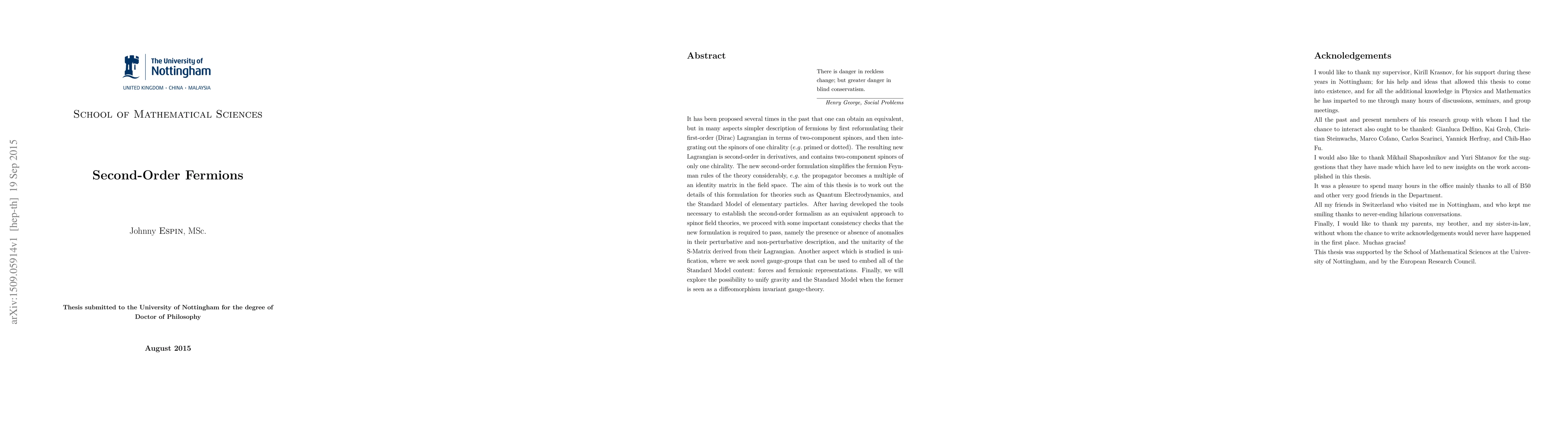 This paper explores a second-order Lagrangian formulation for fermions, simplifying the description by integrating out one chirality and reducing the order of derivatives. It aims to establish the equivalence of this approach to the Standard Model and Quantum Electrodynamics, while investigating consistency, anomaly-freedom, unitarity, and potential unification with gauge-groups and gravity.