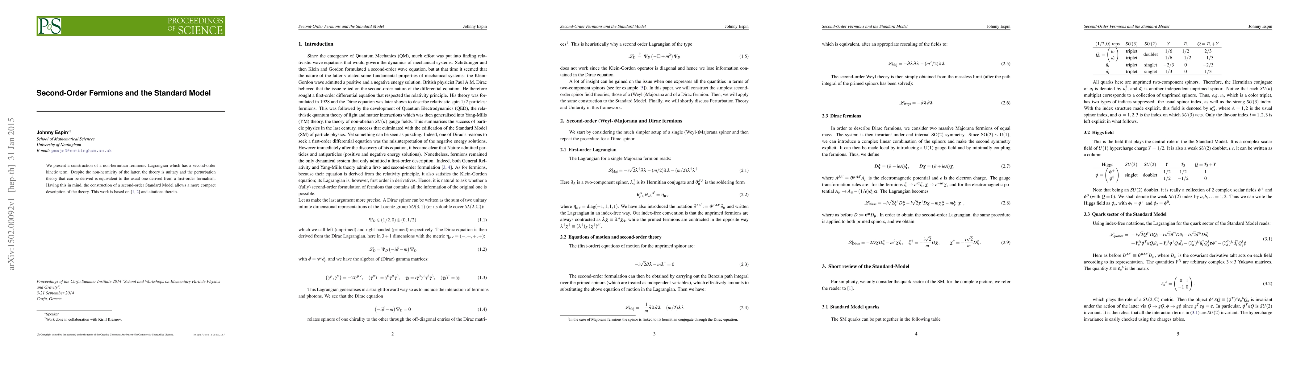 We present a construction of a non-hermitian fermionic Lagrangian which has a second-order kinetic term. Despite the non-hermicity of the latter, the theory is unitary and the perturbation theory that can be derived is equivalent to the usual one derived from a first-order formalism. Having this in mind, the construction of a second-order Standard Model allows a more compact description of the theory. This work is based on [1, 2] and citations therein.