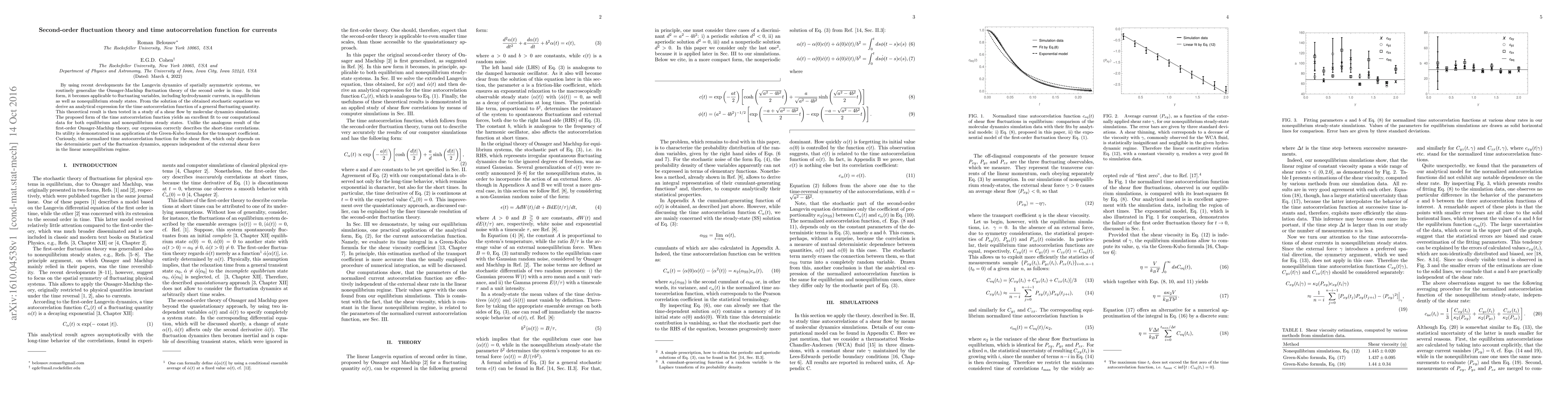 By using recent developments for the Langevin dynamics of spatially asymmetric systems, we routinely generalize the Onsager-Machlup fluctuation theory of the second order in time. In this form, it becomes applicable to fluctuating variables, including hydrodynamic currents, in equilibrium as well as nonequilibrium steady states. From the solution of the obtained stochastic equations we derive an analytical expression for the time autocorrelation function of a general fluctuating quantity. This theoretical result is then tested in a study of a shear flow by molecular dynamics simulations. The proposed form of the time autocorrelation function yields an excellent fit to our computational data for both equilibrium and nonequilibrium steady states. Unlike the analogous result of the first-order Onsager-Machlup theory, our expression correctly describes the short-time correlations. Its utility is demonstrated in an application of the Green-Kubo formula for the transport coefficient. Curiously, the normalized time autocorrelation function for the shear flow, which only depends on the deterministic part of the fluctuation dynamics, appears independent of the external shear force in the linear nonequilibrium regime.