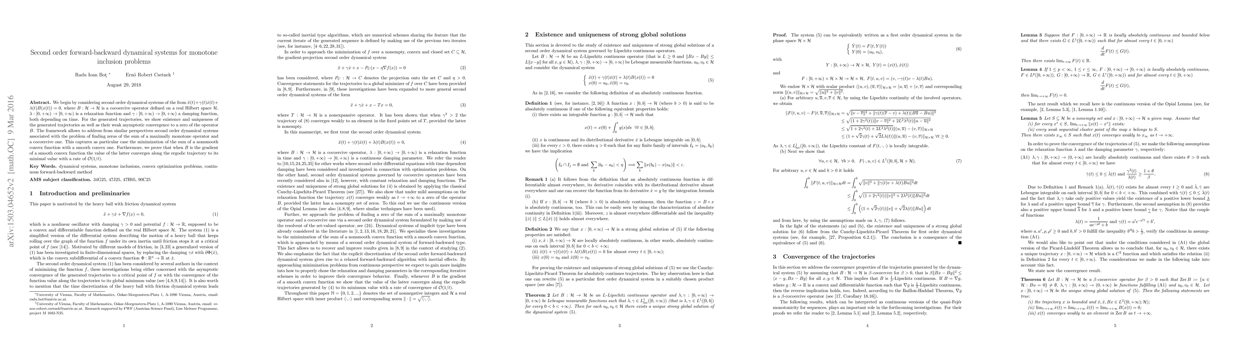 This paper studies second order forward-backward dynamical systems for monotone inclusion problems, proving existence, uniqueness, and weak asymptotic convergence of trajectories to zeros of cocoercive operators. The framework also addresses the minimization of the sum of nonsmooth and smooth convex functions.