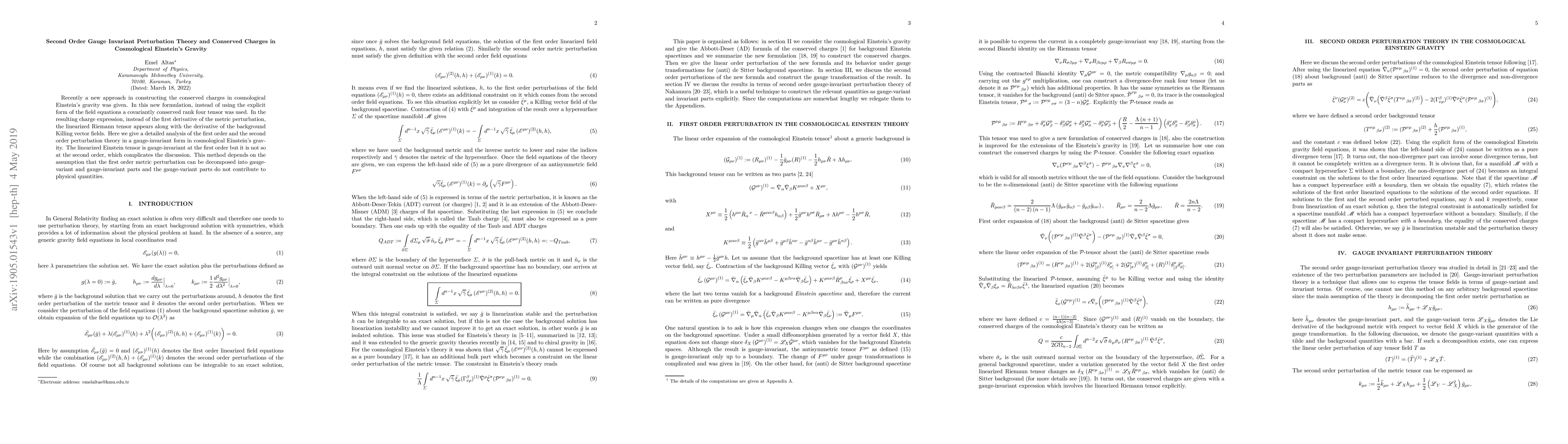 This paper develops a gauge-invariant perturbation theory in cosmological Einstein's gravity, focusing on conserved charges using a covariantly conserved rank four tensor. It analyzes first and second order perturbations, noting that while the linearized Einstein tensor is gauge-invariant at first order, this property does not hold at second order, complicating the analysis.