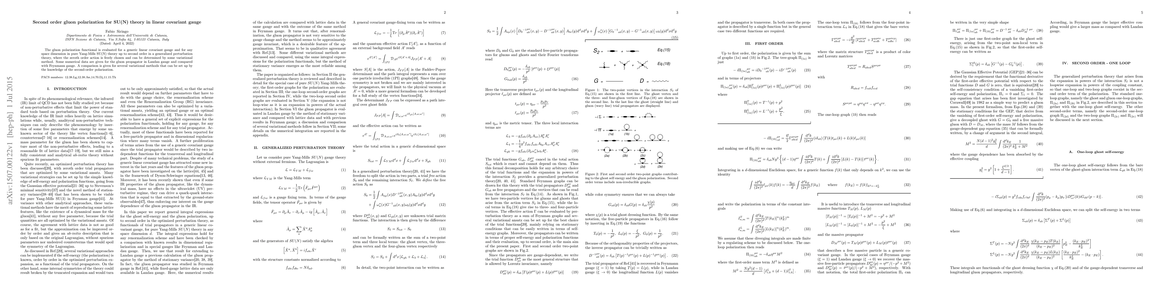The gluon polarization functional is evaluated for a generic linear covariant gauge and for any space dimension in pure Yang-Mills SU(N) theory up to second order in a generalized perturbation theory, where the zeroth order action is freely chosen and can be determined by some variational method. Some numerical data are given for the gluon propagator in Landau gauge and compared with Feynmann gauge. A comparison is given for several variational methods that can be set up by the knowledge of the second-order polarization.
