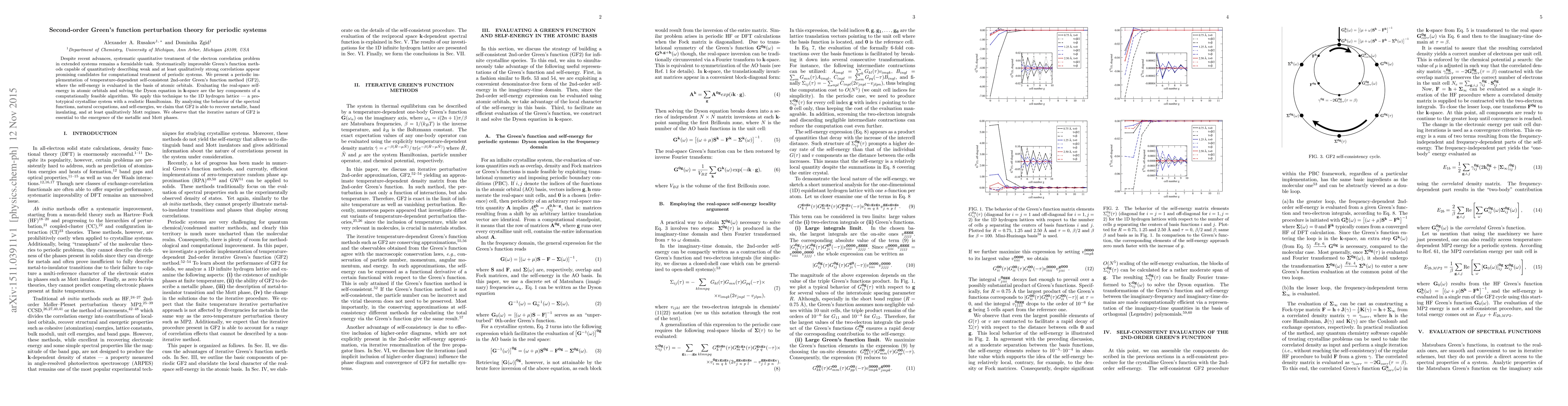 This paper introduces a periodic implementation of the second-order Green's function perturbation theory (GF2) for extended systems, demonstrating its application to a 1D hydrogen lattice. The method shows promise in capturing metallic, band insulating, and Mott regimes, highlighting the importance of its iterative nature for phase emergence.