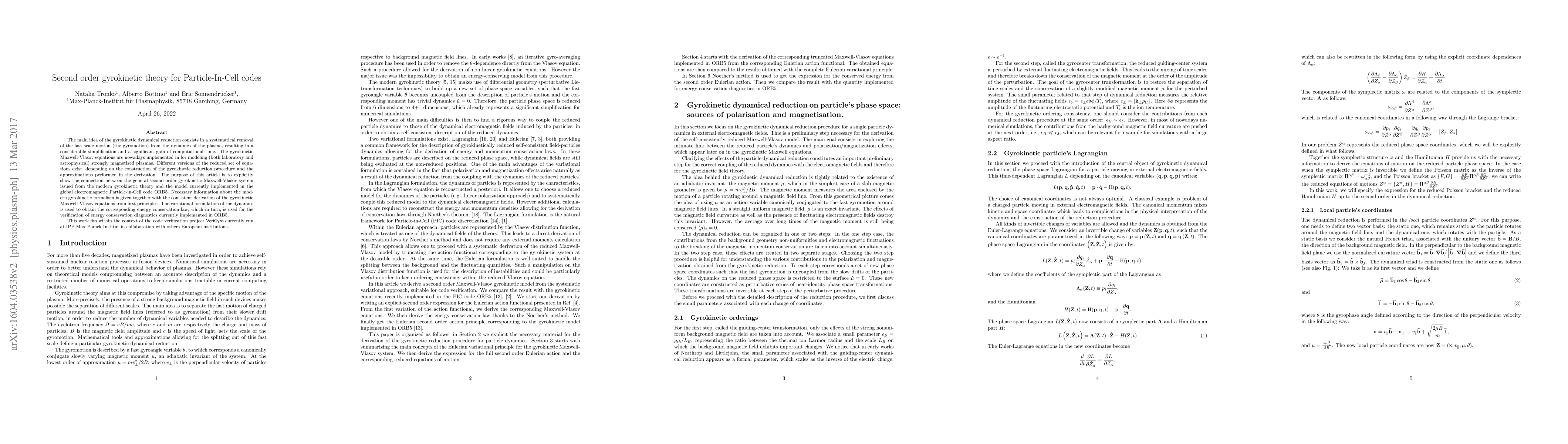 The main idea of Gyrokinetic dynamical reduction consists in systematical removing of fastest scale of motion (the gyro motion) from plasma's dynamics, resulting in a considerable model simplification and gain of computing time. Gyrokinetic Maxwell-Vlasov system is broadly implemented in nowadays numerical experiments for modeling strongly magnetized plasma (both laboratory and astrophysical). Different versions of reduced set of equations exist depending on the construction of the Gyrokinetic reduction procedure and approximations assumed while their derivation. The purpose of this paper is to explicitly show the connection between the general second order gyrokinetic Maxwell-Vlasov system issued from the Modern Gyrokinetic theory derivation and the model currently implemented in global electromagnetic Particle in Cell code ORB5. Strictly necessary information about the Modern Gyrokinetic formalism is given together with the consistent derivation of the gyrokinetic Maxwell-Vlasov equations from the first principle of dynamics. Variational formulation of dynamics is also used for simultaneously obtaining the corresponding exact energy conservation law. The result of that explicit derivation is used for verification of the energy conservation diagnostics currently implemented in ORB5 code. This work subscribes into the context of codes verification project VeriGyro currently run in IPP Max Planck Institut in collaboration with others European institutions.