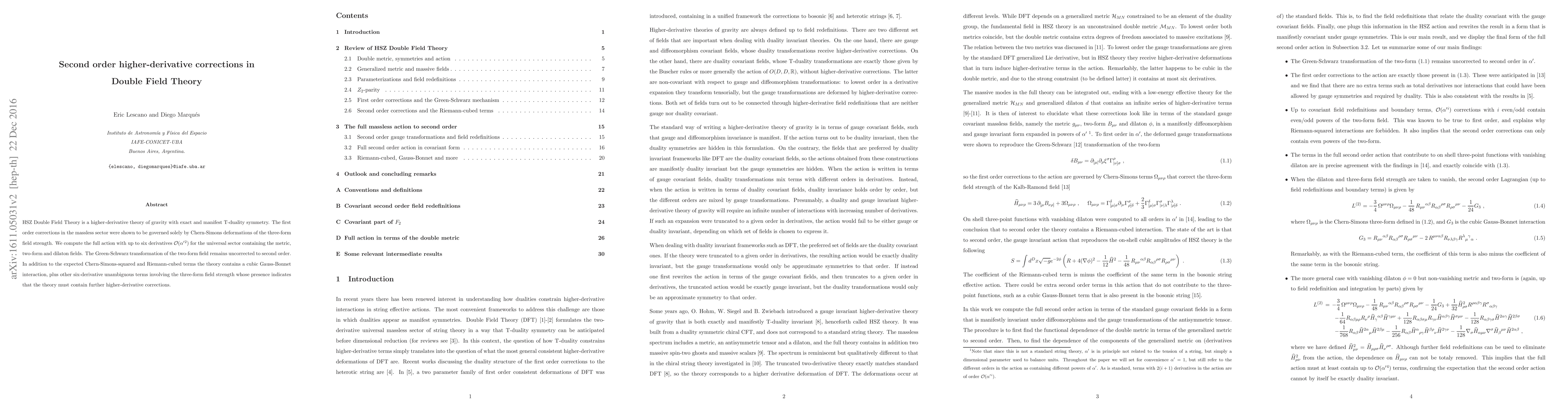 HSZ Double Field Theory is a higher-derivative theory of gravity with exact and manifest T-duality symmetry. The first order corrections in the massless sector were shown to be governed solely by Chern-Simons deformations of the three-form field strength. We compute the full action with up to six derivatives ${\cal O} (\alpha'{}^2)$ for the universal sector containing the metric, two-form and dilaton fields. The Green-Schwarz transformation of the two-form field remains uncorrected to second order. In addition to the expected Chern-Simons-squared and Riemann-cubed terms the theory contains a cubic Gauss-Bonnet interaction, plus other six-derivative unambiguous terms involving the three-form field strength whose presence indicates that the theory must contain further higher-derivative corrections.